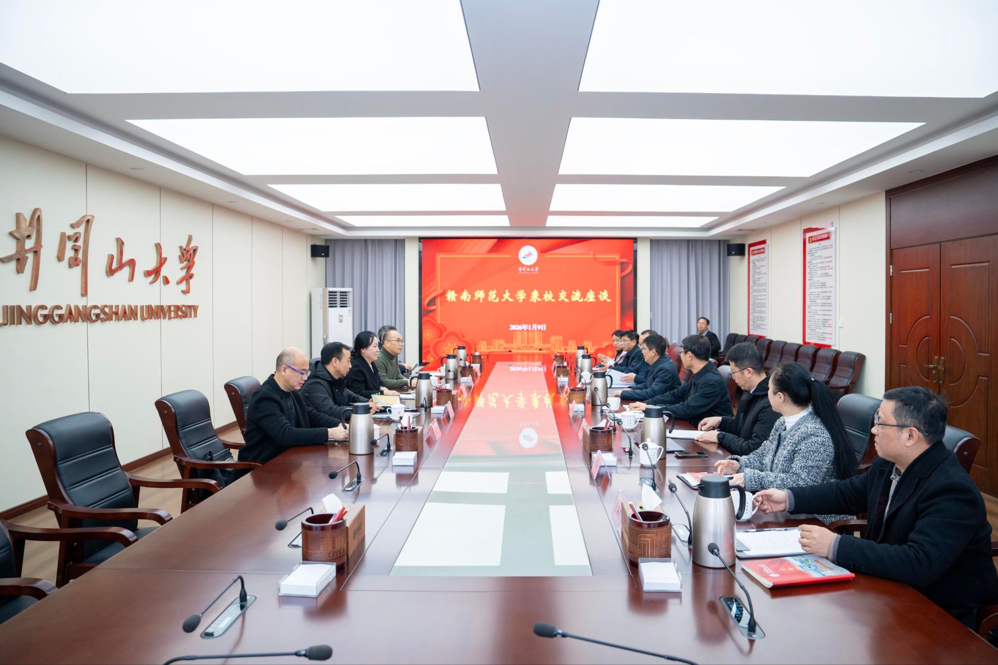 1月9日下午,赣南师范大学党委常委、副校长郭莉、罗世华一行六人来校调研交流,在行政楼二号会议室召开座谈会。校党委书记罗旭彪出席并致辞,党委常委、副校长冷明、敖四江出席座谈会。两校相关职能部门负责同志参加座谈。罗旭彪对郭莉、罗世华一行来校调研交流表示热烈欢迎,介绍了学校的办学历史和办学特色,还分享了学校近年来的发展成果与创新实践。他指出,学校坚持以井冈山精神为引领,敢于突破发展边界,在学科建设、科研创新、...