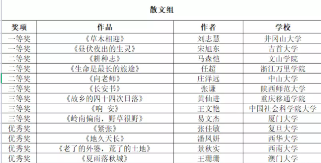 2021年12月31日,全国大学生第八届“野草文学奖”获奖名单揭晓,我校人文学院20级汉本1班学生刘志慧凭借作品《草木相迎》(全文见附件)获得散文组一等奖,全国仅2人获一等奖,刘志慧作品排名第一。此外,人文学院陈婷婷同学凭借作品《西西弗斯的巨石》(全文见附件)获得小说组三等奖。 “野草文学奖”大赛经过第八届全国大学生野草文学奖评奖委员会匿名初审、复审和终审,最终从1164 所大学的7319份有效投稿中评出诗歌组、散文组、小说组获奖者。赛事自2013年设立以来就受到广泛关注,征稿对象为全国大学生,每届都有众多高校的诸多学子参与,如今已极具影响力。
