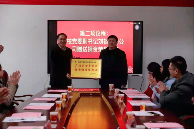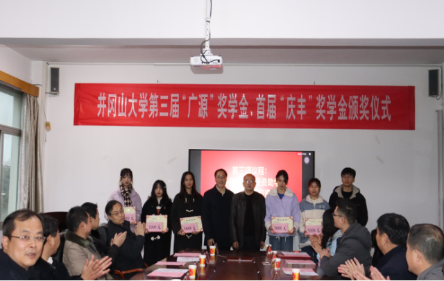 12月30日,学校举行第三届“广源”奖学金、首届“庆丰”奖学金颁奖仪式,校党委副书记刘祖文、江西广源化工有限责任公司党委书记邹检生、吉安市庆丰过滤器材有限公司董事长刘衍锋出席仪式并讲话。刘祖文向邹检生、刘衍锋赠送捐资荣誉锦牌。“广源”奖学金定向捐赠给化学化工学院品学兼优、家庭困难的30名大学生,各有10名同学每人获5000元、3000元、2000元奖学金,“庆丰”奖学金定向捐赠给化学化工学院品学兼优、家庭困难的6名大学生,每人获5000元奖学金。