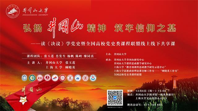 本次共享课是党史联盟在线共享直播课程之第三期。今年,6月19日,井冈山大学积极加入由上海大学发起,井冈山大学、延安大学、湖南大学、西安交通大学、临沂大学、三江学院、贵州工程应用技术学院、皖西学院等10所院校的全国高校党史类课程联盟。党史课程联盟以跨地域高校“项链”式合作模式,赓续红色血脉,讲述有“颜值”有“言值”的党史课,让各高校精心打造的党史课程传播更远,受众更多。(文:张玉莲 审核:肖发生、郭伟清、胡正佩)