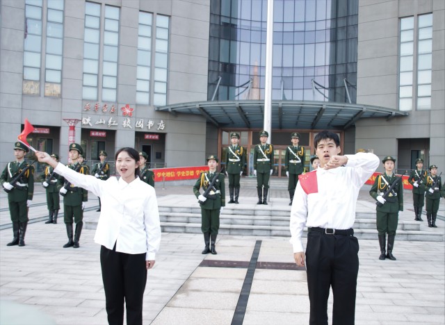 早上七点,国庆特别升旗仪式活动在映山红广场庄严举行,映山红国旗护卫队迎着朝阳,昂首阔步,庄严出旗。鲜艳的五星红旗迎风招展,在全场庄严的国歌声中冉冉升起,全体师生心怀敬意行注目礼。