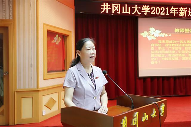 胡春晓首先向新加入井冈山大学大家庭的40名教师表示热烈欢迎,现场与大家一道学习了今年教师节前夕习近平总书记给全国高校黄大年式教师团队代表回信精神。胡春晓在介绍学校师资队伍建设情况后对新进教师提出了殷切的希望。她强调,要做一名从政治、思想、品行三个维度涵养良好师德师风的好老师,每个教师以言行立身,做一个师德高尚的人,教育引导学生在实现中华民族伟大复兴中国梦中贡献自己的才智和力量。要做一名敬业守责,爱生重教的好老师,要有情怀、有大爱,敢于奉献和担当,切实关爱学生,和学生共成长,既要教书更要育人,用渊博的知识、良好的职业道德和独特的人格魅力去感召学生,赢得学生的爱戴和尊重,要关心学生、理解学生、信任学生,把正能量传递给学生。要做一名扎根老区、担当作为的好老师,尽快适应工作环境,克服困难,肯于吃苦,敢于挑战,将自己专业特长与学校特色学科相结合、将个人的发展和学校的发展相结合,扎根井大、成就自己、服务学校。希望大家牢记学校“广学坚守、勤思敏行”校训,发扬跨越时空的井冈山精神,秉承热爱教育、热爱学生、热爱学术的优良传统,努力成为广受学生爱戴的好教师,为把井冈山大学建设成为区域高水平应用研究型综合性大学而不懈努力。