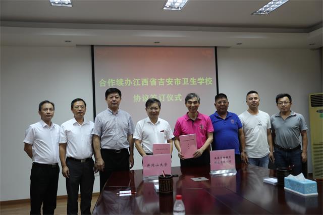 7月14日,井冈山大学和南昌桔桉教育科技有限公司合作续办吉安市卫生学校协议签订仪式在校举行,党委副书记、校长曾建平,南昌职业大学理事长、南昌五中校长章跃进分别代表双方签约并讲话,党委常委、副校长李军主持签约仪式,吉安卫校和校办有关负责人参加了签约仪式。