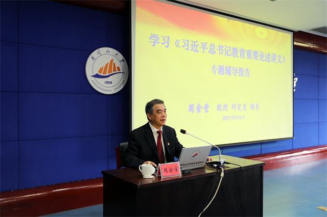 周金堂从当前正在开展的党史学习教育入题,深入阐述了学习习近平总书记关于教育的重要论述的重大意义,结合习近平总书记4月20日考察清华大学时的重要讲话,详细解读了《习近平总书记教育重要论述讲义》的主要内容和科学内涵,并就认真学习、深刻领会、全面贯彻落实习近平总书记关于教育的重要论述,努力办人民满意教育进行了全面阐释。他希望学校进一步学深学透、落细落实习近平总书记关于教育的重要论述,立足中国实际、扎根老区办学,奋力办好新时代人民满意教育。