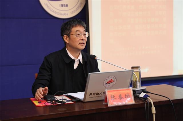 4月7日,党史学习教育省委宣讲团在井冈山大学举行专题宣讲报告会,省委宣讲团成员、井冈山大学原校长张泰城作专题宣讲,校党委书记胡春晓主持,在家的全体校领导出席,校党委理论学习中心组全体成员,全校正、副处级干部,全体党支部书记,学生党员代表200余人聆听了宣讲。