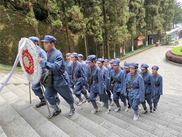 在北山烈士陵园,学员们拾级而上,为革命先烈们献上花圈,整理挽联,集体默哀,瞻仰革命遗存,追忆英雄事迹,聆听四万八千多名革命烈士革命故事,寄托对革命先烈的深切哀思。