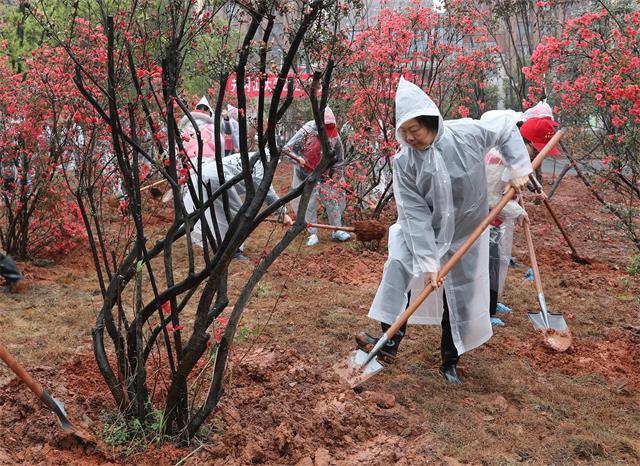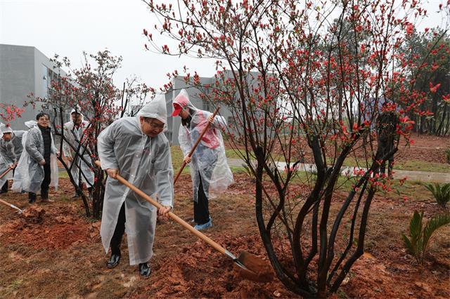 春风吐绿,草木初萌,又是一年植树季。3月11日上午,学校党政班子领导胡春晓、曾建平、吕玉华、史胜平、黄俭根、李军、陈建军、李裕福、肖洪海,冒着霏霏细雨来到北区生命科学实验教学楼前广场,开展植树造林活动。活动中,校领导身体力行,拿起工具,挥锹铲土,扶苗填坑,每一道工序都做得十分认真,不一会儿,校领导就栽好了10余株火红火红的映山红。植树现场,我校数十名映山红青年学生志愿者也不甘落后,热火朝天的干了起来,植树气氛十分活跃。 近期,学校将动员全校师生在校园内种植湿地松1000棵、红叶石楠700棵、铁树200棵、樟树110棵、映山红70余株,海藻、龟早冬青球、茶梅100余株。此外,学校还计划播撒湿地松种子10亩,铺设草皮13000平方米。本次植树造林活动也得到了校友的大力支持和赞助,共收到校友捐赠湿地松和映山红树苗1000余棵,以及大量的湿地松种子。