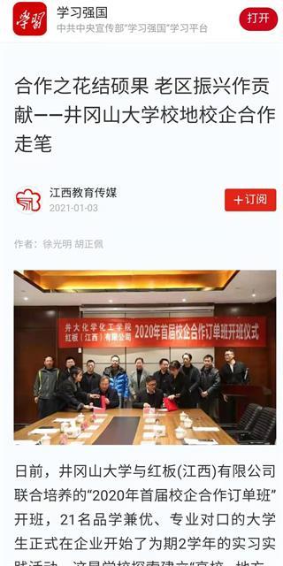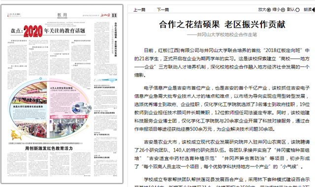 连日来,多家国家、省市级主流媒体聚焦我校开展校地校企合作。2020年12月29日,中国教育新闻网以《井冈山大学:产学研合作助推脱贫攻坚》为题,推出了我校通过产学研合作助推老区脱贫攻坚的报道,2021年1月3日,学习强国以《合作之花结硕果老区振兴作贡献——井冈山大学校地校企合作走笔》为题,图文并茂地推出了我校开展校地校企合作的长篇通讯报道,全文近3000字。1月4日,江西日报第11版以《合作之花结硕果老区振兴作贡献——井冈山大学校地校企合作走笔》为题,推出了我校开展校地校企合作的长篇通讯报道,全文约1000字,1月3日,井冈山报头版头条以《三方联动聚合力 服务经济促发展——井冈山大学开展校地校企合作走笔》为题,推出了我校开展校地校企合作的长篇通讯报道,全文2400余字。