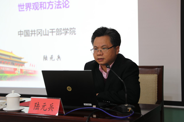 在中国井冈山干部学院多功能教室,中井院教学科研部科研管理处处长陆元兵教授应邀为中心组全体成员作了一场题为《深入学习贯彻党的二十大精神 牢牢把握习近平新时代中国特色社会主义思想的世界观和方法论》的专题辅导报告。校党委书记胡春晓主持报告会。