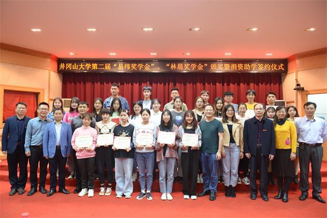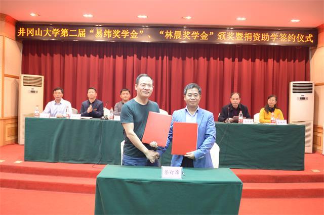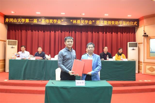 10月27日,学校举行第二届林晨奖学金、易纬奖学金颁奖暨捐资助学协议签约仪式,25名品学兼优的大学生获2.5万元奖学金。井冈山大学党委书记胡春晓,党委副书记、校长曾建平会见了福州赶学教育集团董事长林晨、广州市易纬电子有限公司副总经理陈波先生等一行,党委常委、副校长肖宜安代表学校分别与福州市台江区赶学职业培训学校、广州市易纬电子有限公司签订了《捐资助学协议》,并为两家公司赠送了捐资荣誉锦牌,对他们的义举表示感谢。