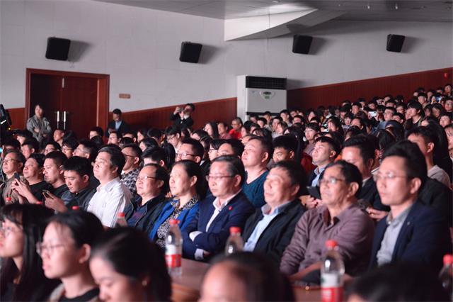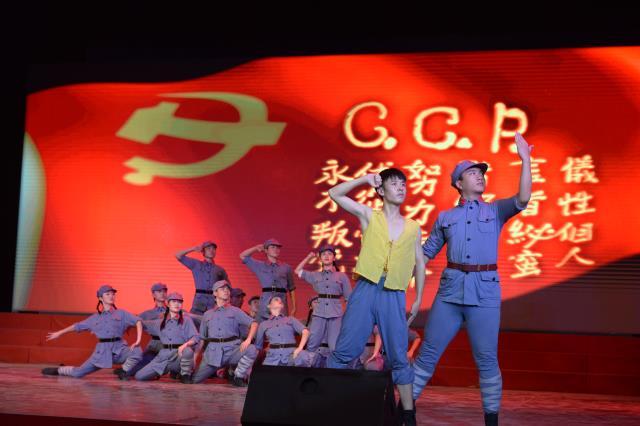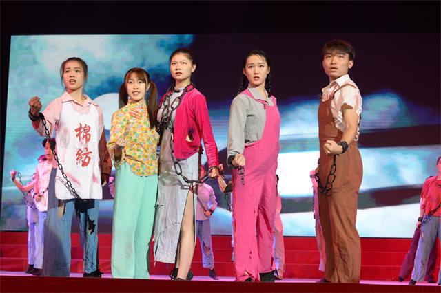 演出结束后,校领导和嘉宾走上舞台和大学生演员合影留念。