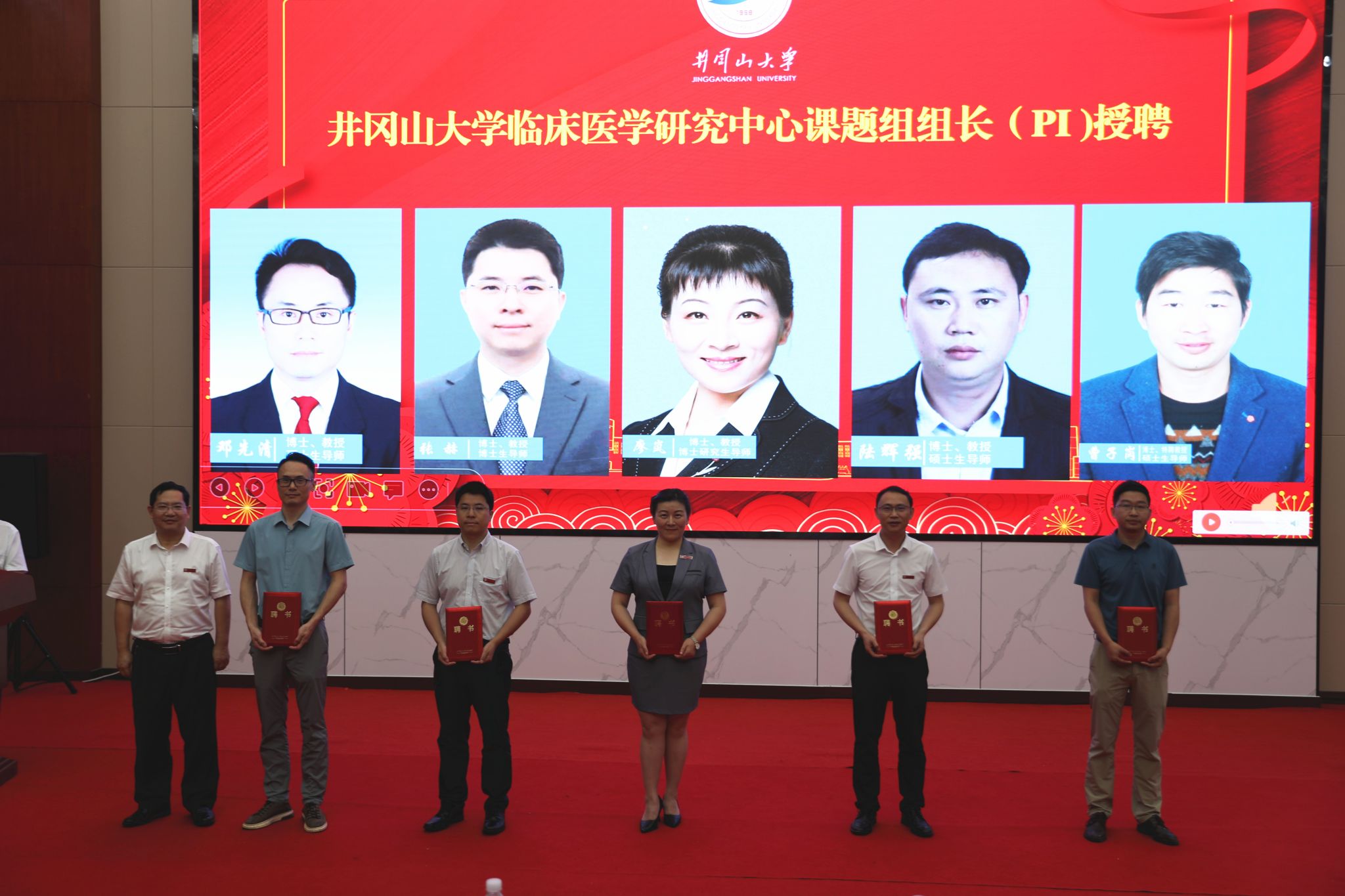 6月13日下午,学校举行井冈山大学医学研究中心揭牌仪式。党委书记胡春晓,党委副书记、校长罗旭彪,党委常委、副校长肖宜安,党委常委、副校长廖岚,校长助理张赫,吉安市卫健委副主任刘忠开以及学校有关职能部门负责人手印屏幕正式启动仪式,罗旭彪和井冈山大学附属医院院长谭立宇为井冈山大学医学研究中心揭牌,谭立宇为廖岚、张赫、陆辉强、邓先清、曹子岗5名PI课题负责人颁发聘书。 廖岚和医学部党委书记康永平分别主持仪式,刘忠开和井冈山大学附属医院党委书记肖游章分别致辞。临床医学研究中心管委会成员、井冈山大学附属医院主要领导及分管领导以及PI课题组及揭榜挂帅课题组所有成员以及院(部)相关成员参加仪式。