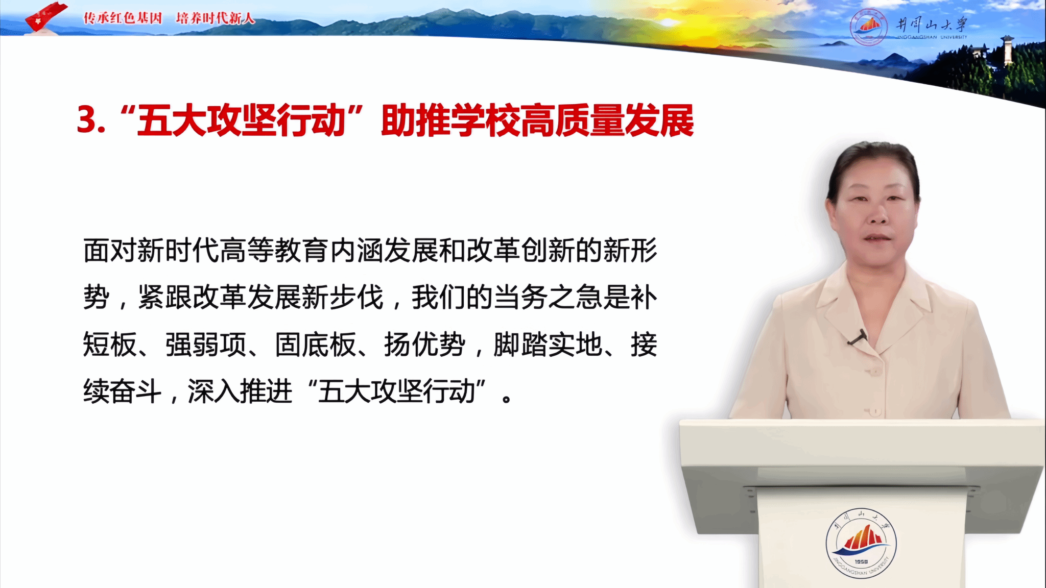 胡春晓在开学第一课中回顾了学校65年发展的历史进程,重点阐述了井冈山大学在传承红色基因,坚持以井冈山精神办学育人方面取得的成效、在思政育人方面的特色做法以及未来五年的发展思路等内容。