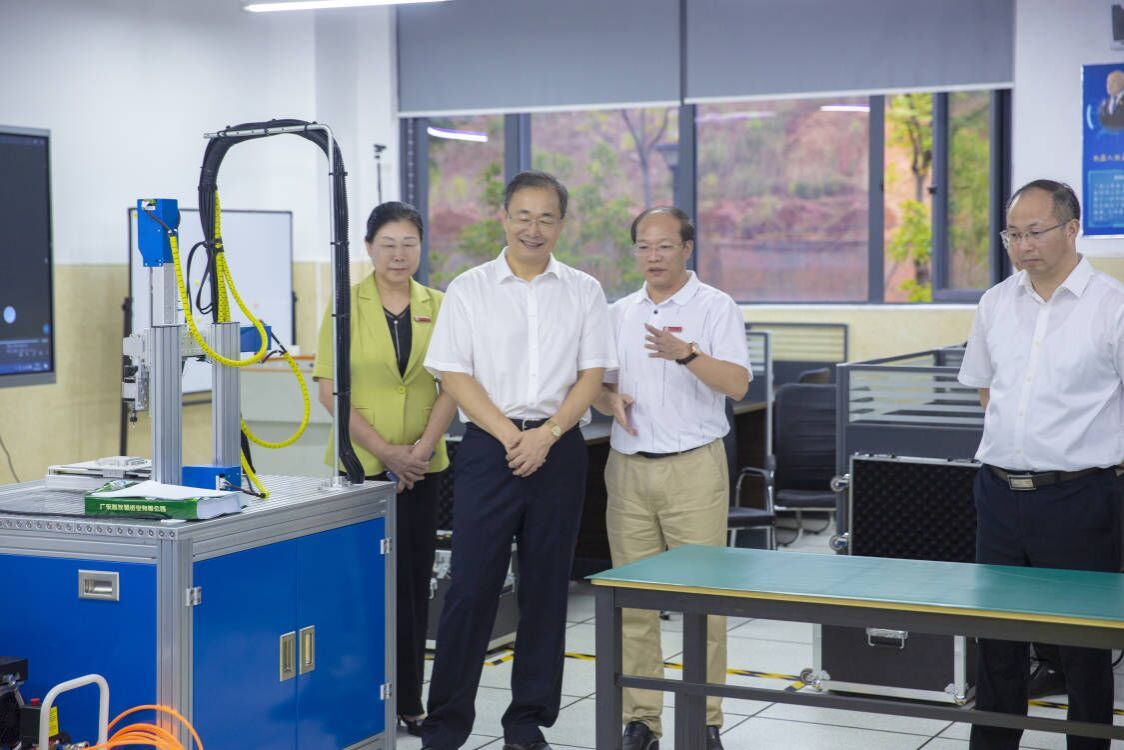 孙洪山参观考察了机器人综合实训室,该实训室能有效对接企业生产实际,集成了机械、电子、光学、传感器、自动控制、计算机与信息等多种技术,为教师和学生提供了一个教学、竞赛、科研为一体的产教融合示范基地,教学内容、方法和手段全面引进CDIO教学实验模式,使学生能在“做中学、学中做”,提高学生的创新能力和动手能力。孙洪山指出,实验室技术要转化到企业生产应用上。要让学生充分利用实验室资源,激发学生学习主观能动性与科学实践积极性,培养学生创新意识与创新能力。