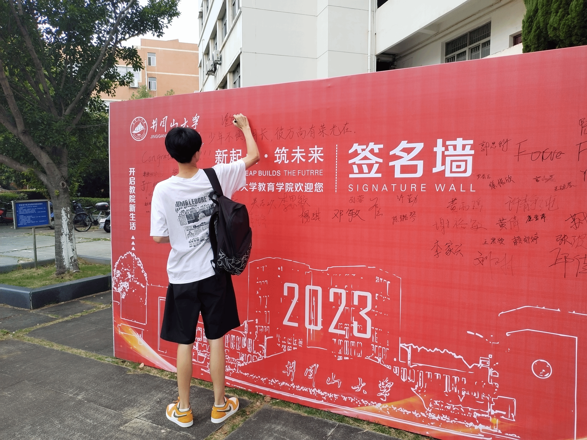 教育学院和外国语学院的签名墙上,萌新们纷纷留下自己飞扬的字迹,签名墙记住的不只是他们的名字,更是他们对于大学生活的憧憬。