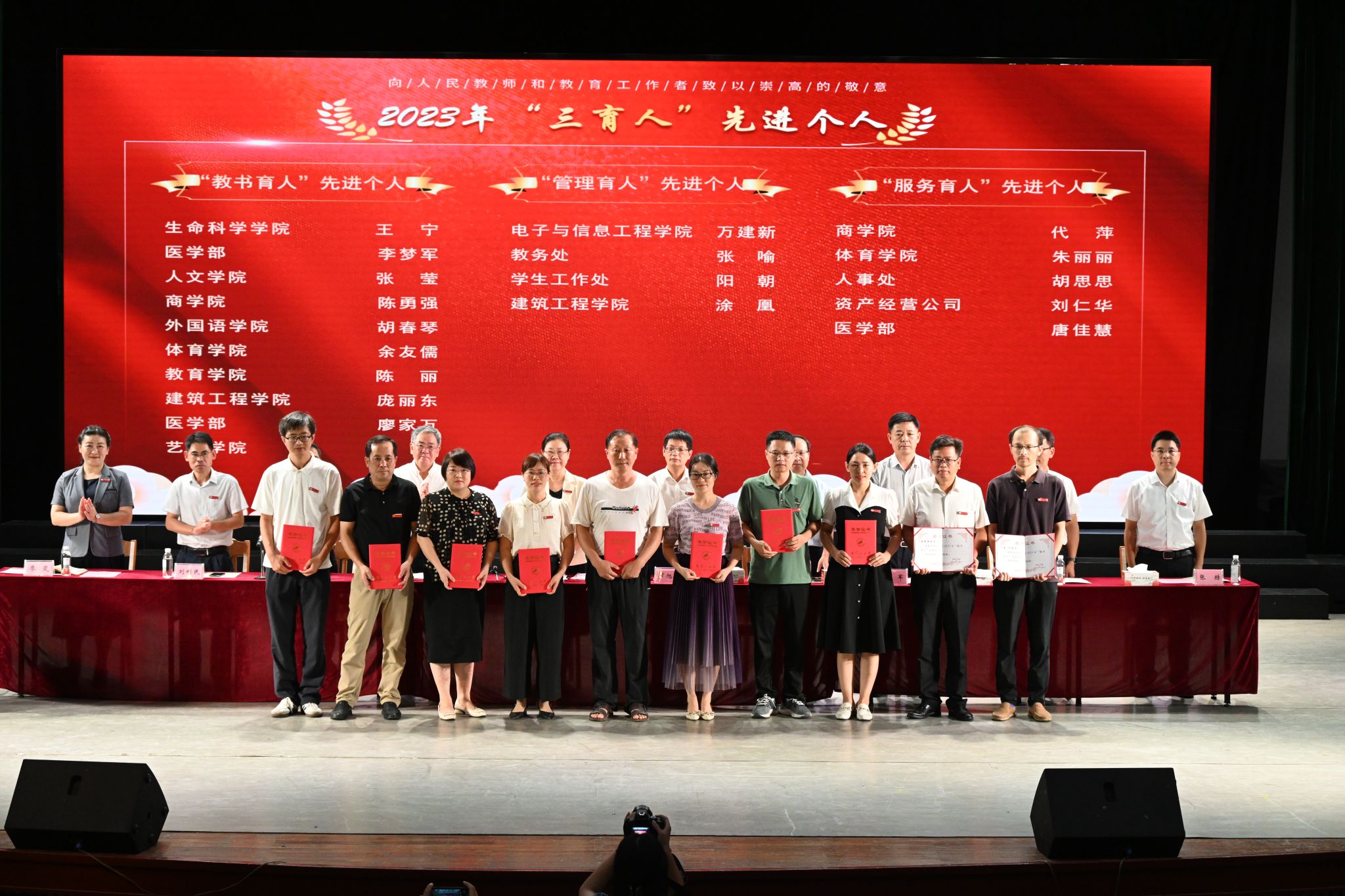 大会隆重表彰了学校过去一年获得省部级以上奖励的先进集体、先进个人以及2023年“三育人”先进个人代表,校领导依次为他们颁奖,勉励他们珍惜荣誉、再接再厉,在今后的工作中取得更好成绩,做出更大贡献,并号召全校师生向他们学习。学生代表机电工程学院22机制1班邢振斌同学为教师节献词,表达了对全校教职工的衷心感谢和节日祝福,以及在老师的教导下努力成为信念坚定、忠诚担当、勇于胜利、能堪大任的井冈特质时代新人的信心和决心。先进个人代表、2023年学校“三育人”先进个人获得者、建筑工程学院教师涂凰老师在发言中回顾了教书育人路上的心得体会,表示保持这份初心和热爱,心怀赤诚的站在教育的舞台上,用爱与智慧为青春导航。新进教师代表张凯博士感谢学校给了自己一个展现自我、实现育人理想和学术抱负的平台,表示将迅速投入到各项工作之中,为学校贡献一份力量。