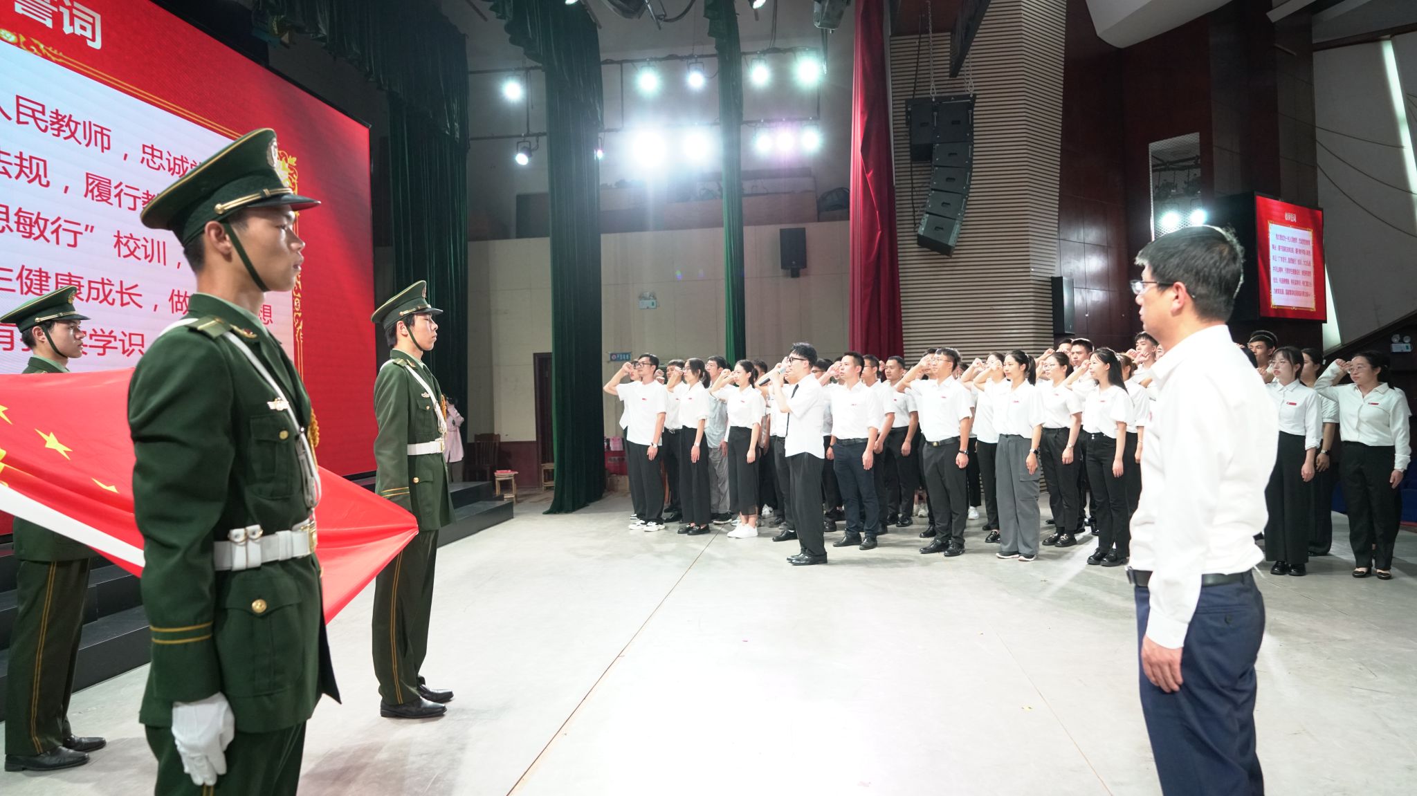 大会举行了新进教师入职宣誓、师德师风承诺签订、退休教职工荣退等形式多样、主题鲜明的活动。在新进教师入职宣誓仪式上,新进教师代表张凯老师带领今年67名新进教师面向国旗庄严宣誓,校长罗旭彪监誓。大家表示,谨记今天的誓言,坚定理想信念,心怀“国之大者”,在全面建设社会主义现代化国家的新征程中勇担培育时代新人的历史使命,以昂扬向上的精神面貌和立德树人的扎实行动,为传承红色基因和振兴老区教育贡献青春和热血。