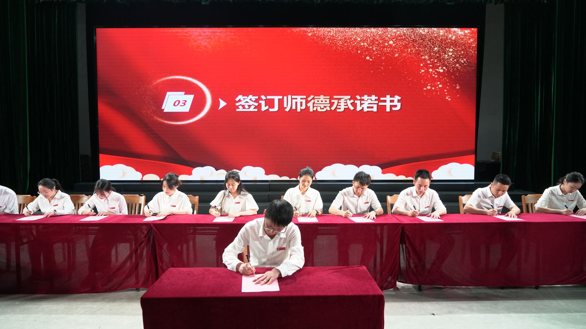 在师德师风承诺书签字仪式上,罗旭彪带领新进教师签订师德承诺书,新进教师一同郑重地在承诺书上签上了自己的名字,大家表示将信守师德承诺,履职尽责,争做新时代“四有”好老师,为传承红色基因和振兴老区教育挥洒青春和热血。