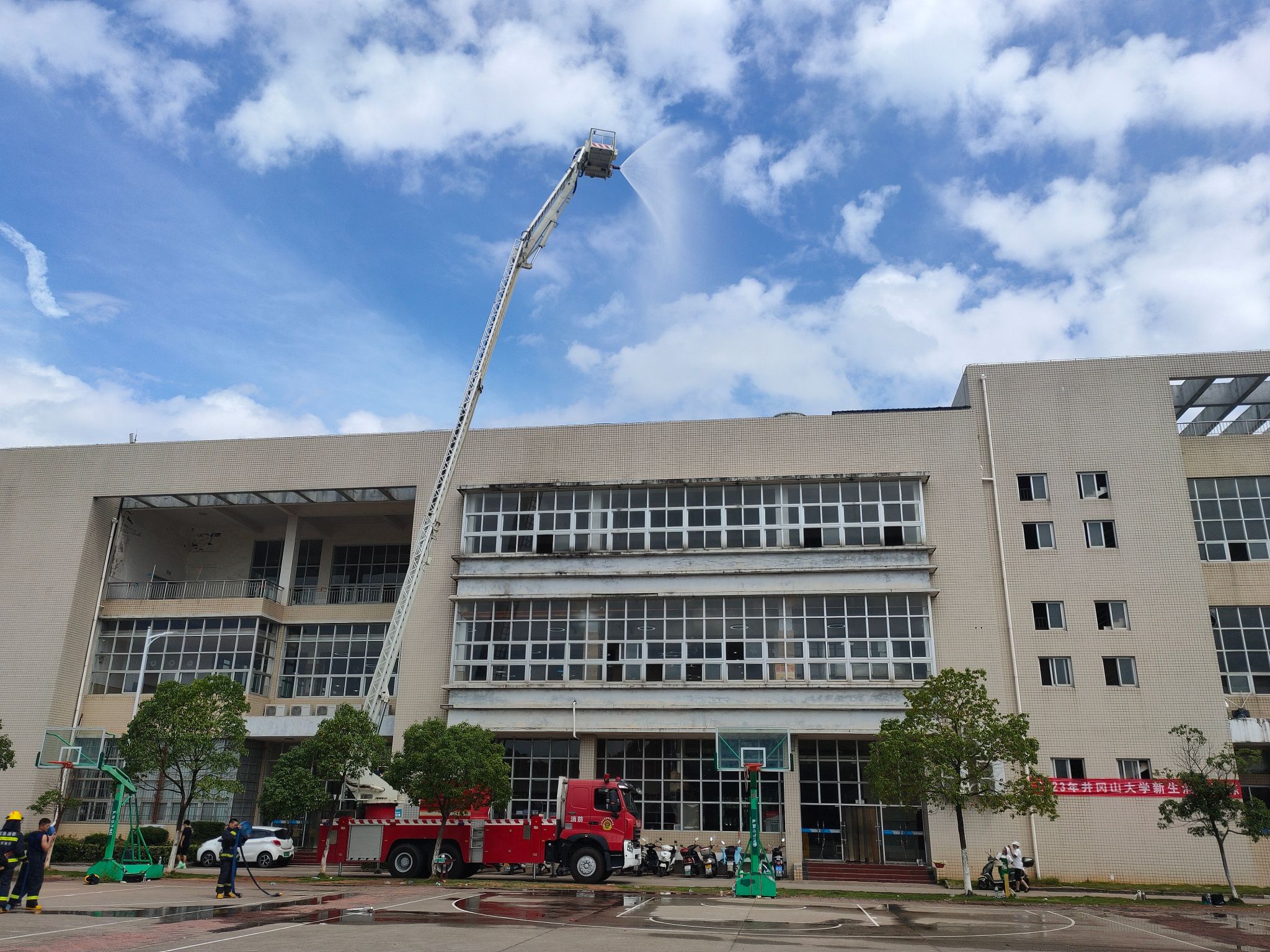 为使师生掌握基本的消防安全知识,提高师生的安全意识和自救自护能力,切实保障师生在突发事件来临时的生命安全,9月12日上午,我校分两批为5400多名2023级本科新生开展了消防应急救护演练。学校特别邀请了青原区消防救援大队、井冈山大学附属医院等单位来校开展多科目演练。在活动现场,专业人员用通俗易懂的语言为同学们讲解了如何防火、如何逃生、如何保护自己以及灭火器、消防栓的使用方法等消防知识,同学们对灭火进行亲身体验。消防官兵和医护人员为同学们进行了消防实操、高空救援、心肺复苏急救等科目的讲解和展示。