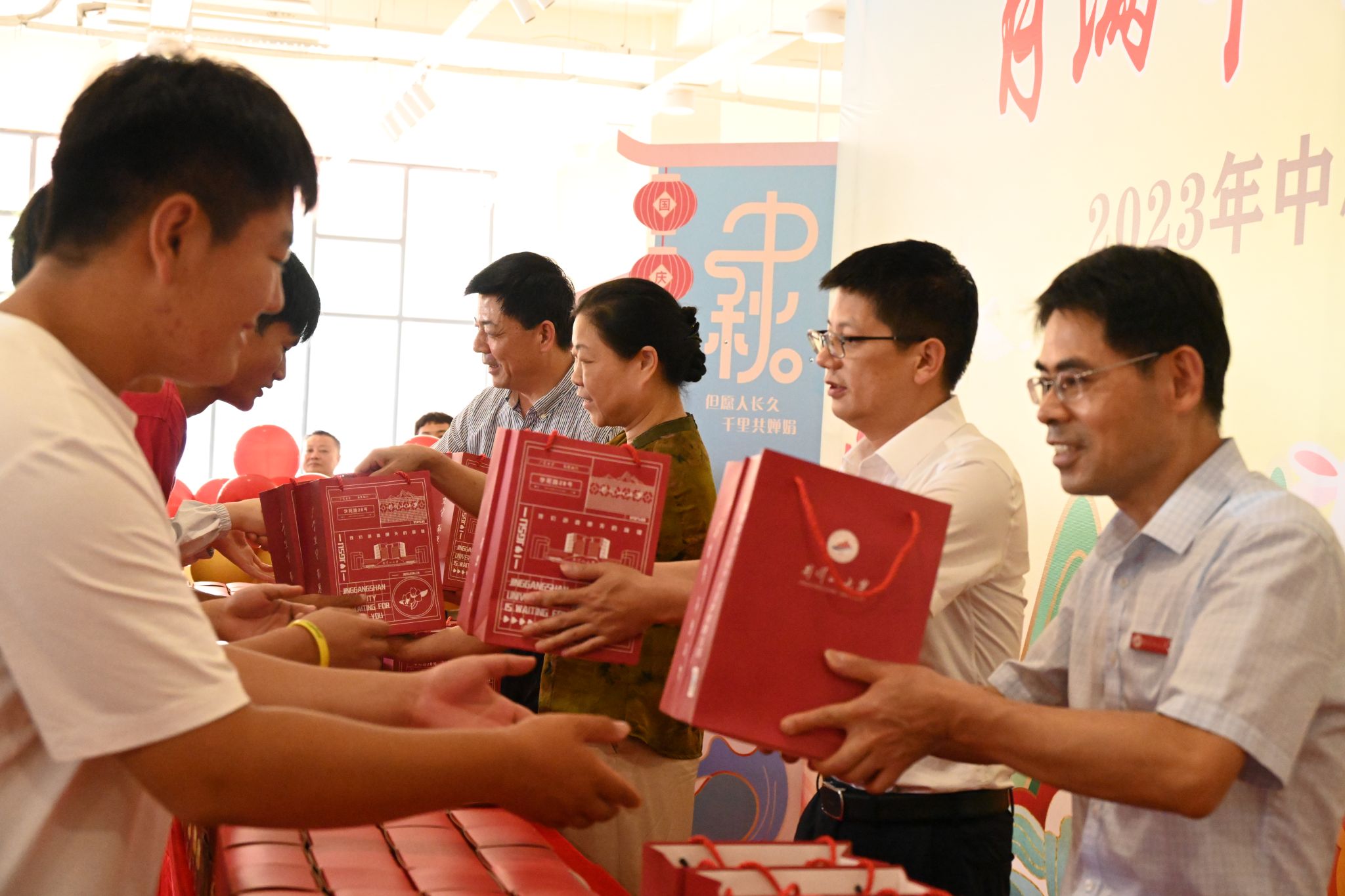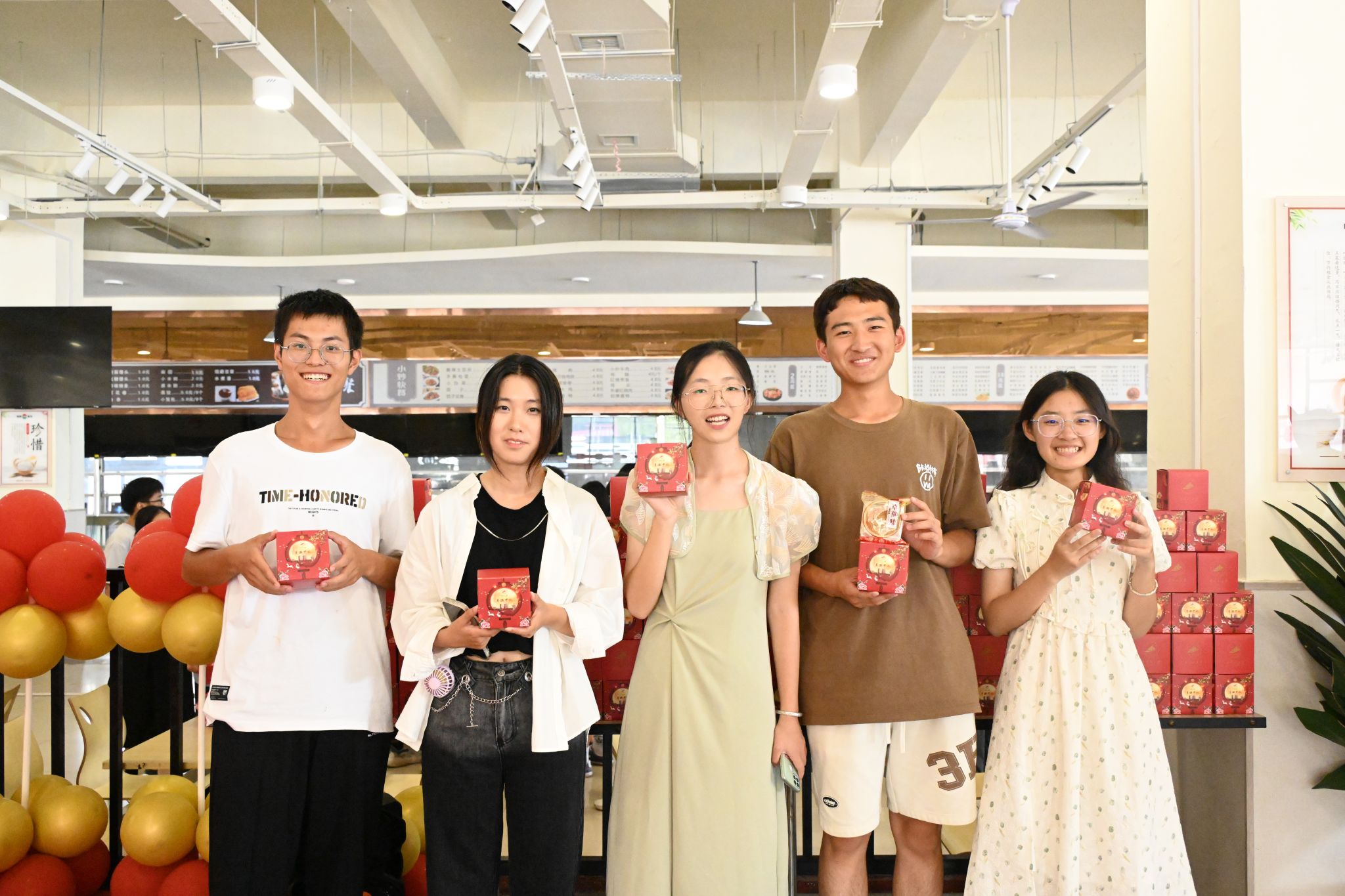 校领导一边分发月饼,一边与大学生进行亲切交谈,现场氛围温馨融洽。“井大专属定制月饼”以盲盒的形式呈现,小小的一盒定制月饼,代表着学校的一种关怀,传递着对学子的暖心祝福,现场的同学们拿着月饼一同品尝,向家长分享,拍照记录着,感受着家的氛围,脸上挂满笑容,洋溢着幸福与喜悦,在校园中度过温馨又美好的中秋时光。