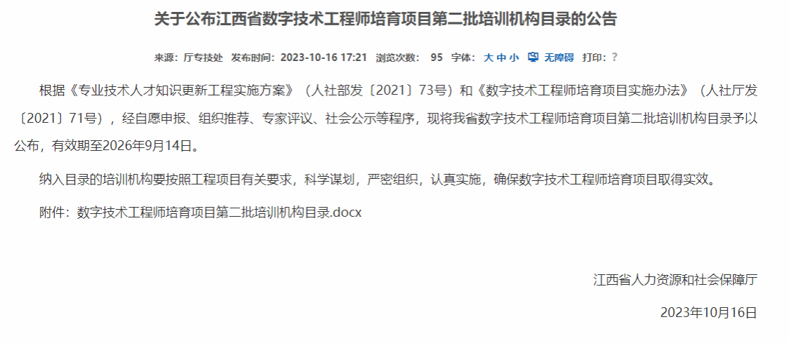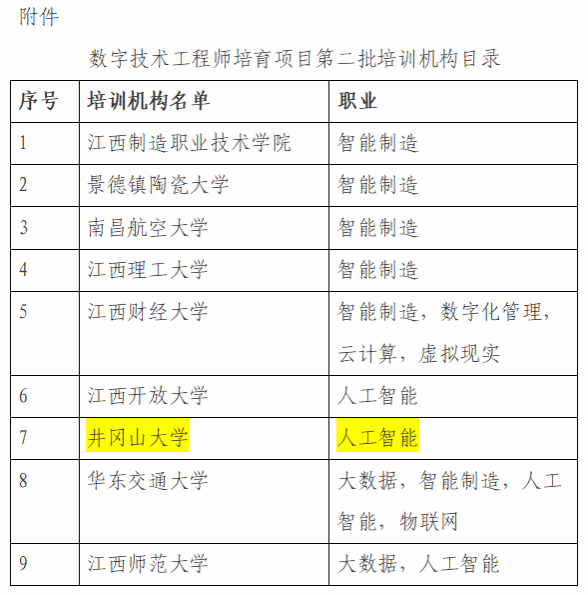2023年10月16日,江西省人力资源和社会保障厅公布了江西省数字技术工程师培育项目第二批培训机构目录,我校电子与信息工程学院申报的人工智能工程技术人员培育项目培训机构成功获批。