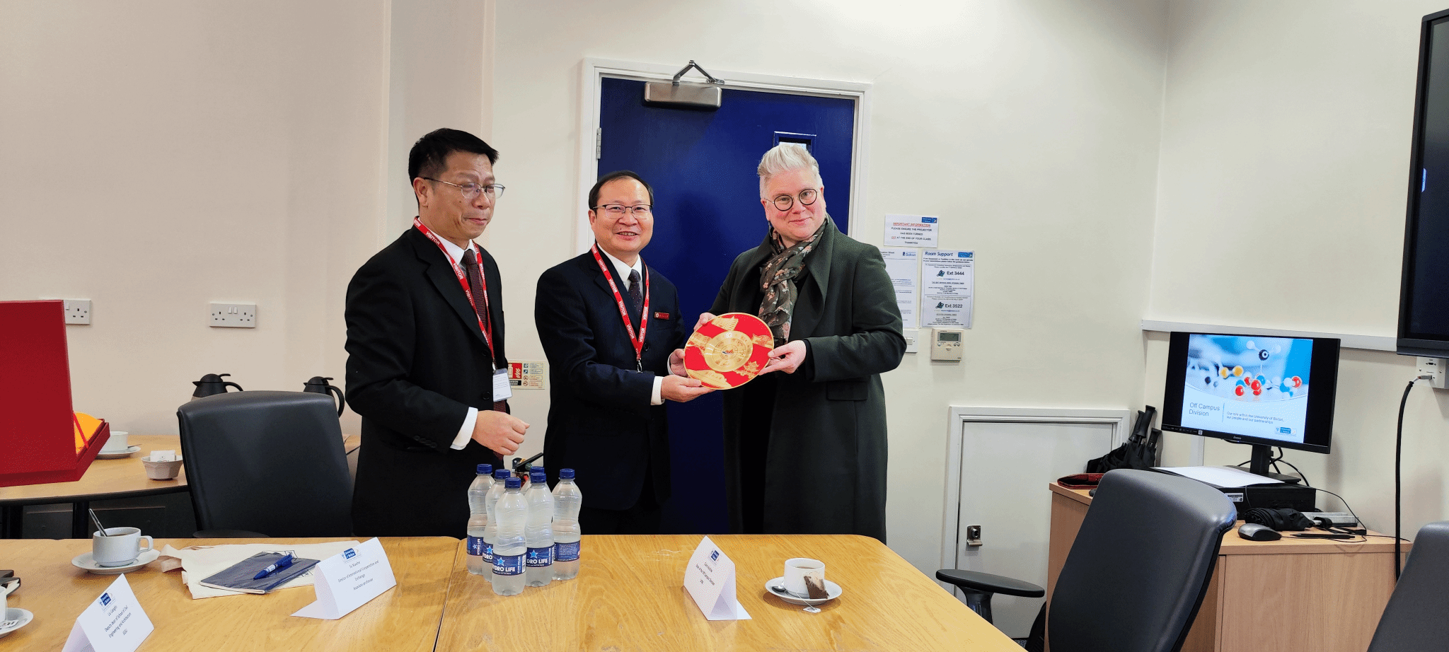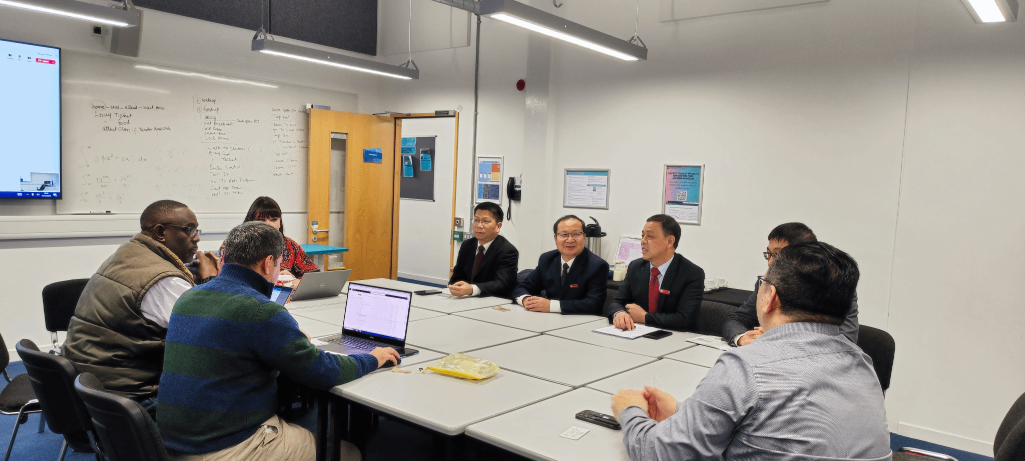 在朴次茅斯大学(伦敦校区),该校执行副校长刘凯接待了代表团一行。座谈会上,双方介绍了学校的基本情况,并就人员互访、教师学术交流、学生短期文化交流等具体事项进行了深入探讨,并一致同意尽快促成项目落地。
