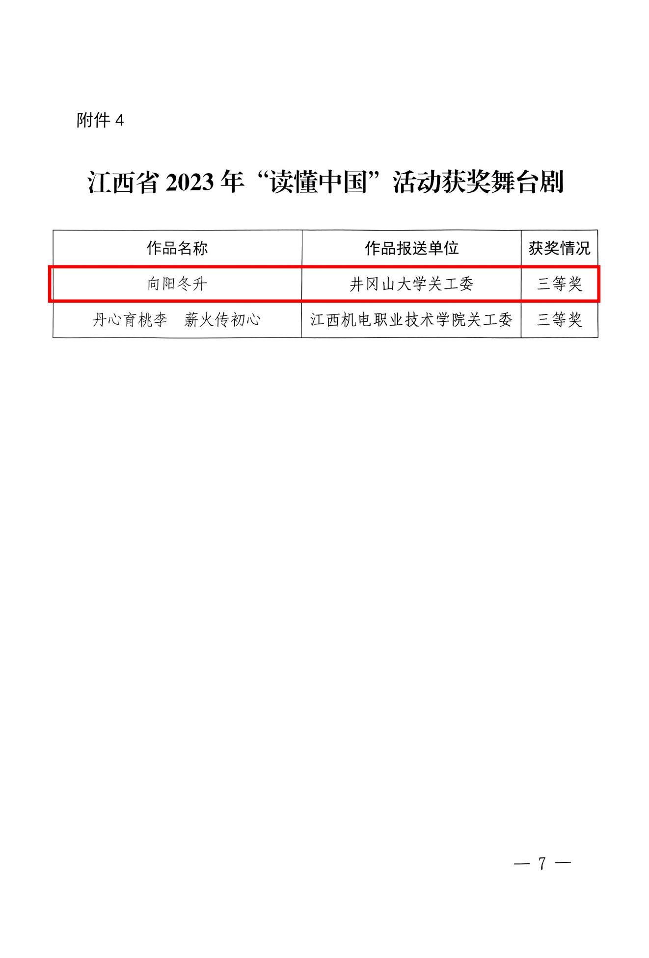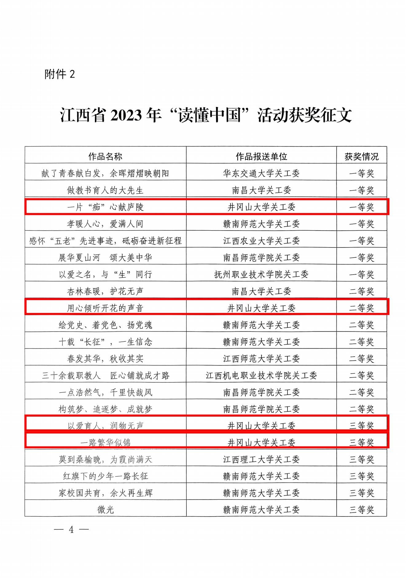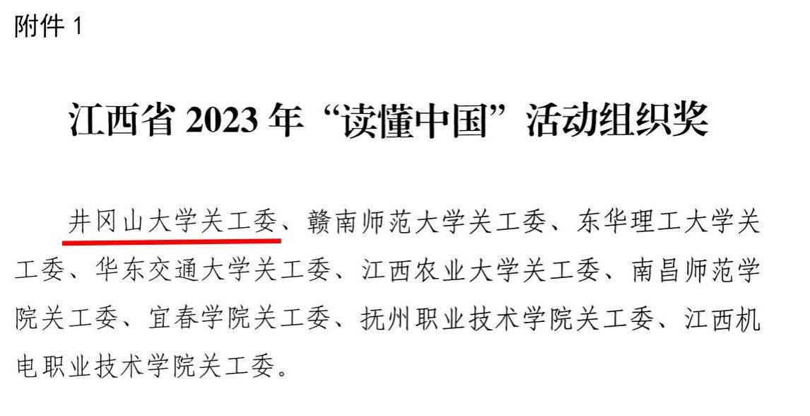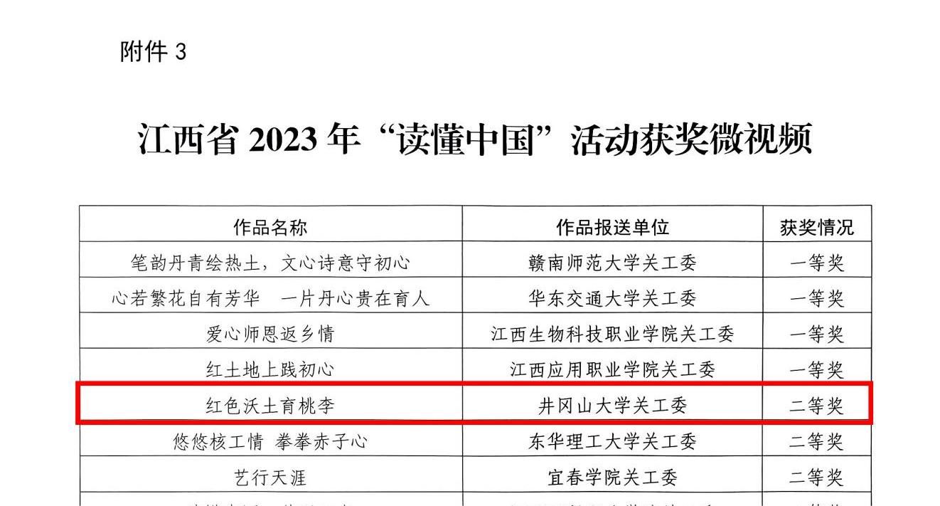 近日,省教育厅关工委发布全省高校2023年“读懂中国”活动作品评审结果,我校选送的征文、微视频、舞台剧获得良好成绩,其中《一片“痴”心献庐陵》获征文一等奖、《用心倾听开花的声音》获征文二等奖、《以爱育人,润物无声》《一路繁华似锦》获征文三等奖、《红色沃土育桃李》获微视频二等奖、《向阳冬升》获舞台剧三等奖。我校还获2023年“读懂中国”活动组织奖。