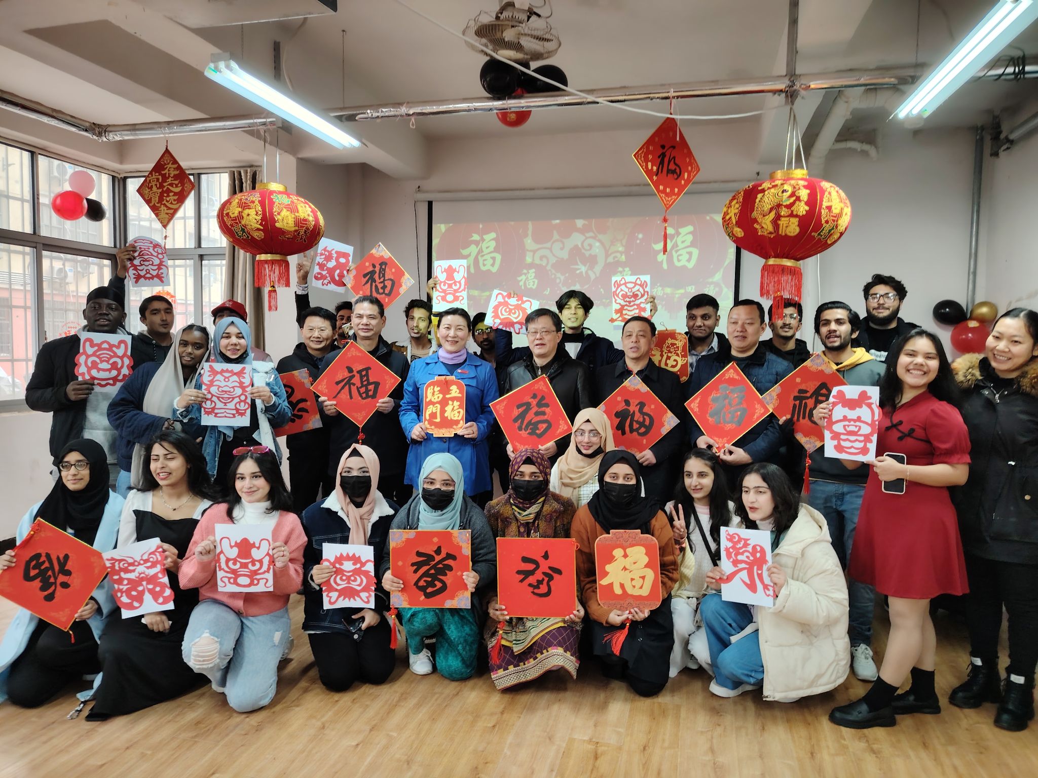 廖岚一行还来到留学生宿舍,走访慰问留学生代表,并给留学生送上了新年大礼包。在老师的带领下,留学生们自己动手在宿舍大门口挂起红灯笼,贴上喜庆的春联和“五福临门”窗花。廖岚十分关心留学生寒假期间的学习和生活,勉励大家充分利用假期时间进一步学好知识,提高安全意识,注意宿舍用电安全,并祝愿大家在井大度过一个开心、快乐的中国年。