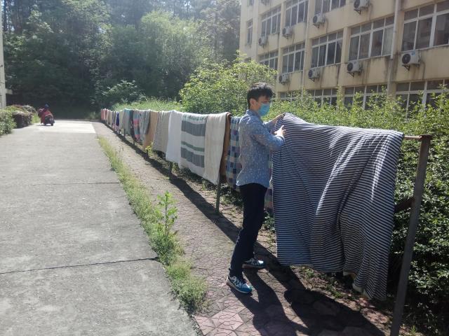 4月27日天气晴,井大阳光正好。辅导员老师齐齐上阵,为学生晒起了被子。老师们把被子从宿舍中取出来放到阳光充足处晾晒,每条被子会至少晾晒3小时以上。到了中午,还会细心地给被子“翻个身”,并不时地“敲打”被子。为避免弄混、弄错学生的被子,辅导员还贴心地按寝室门牌号和床位号制作了每床被子的信息标签,以保证晾晒后的被子都能正确归位。阳光明媚、春风十里,一床床被子整齐排列,沐浴阳光,不能回校的同学们再也不用担心被子发霉了。辅导员们表示:“希望学生回校后能够盖上有阳光味道的被子”。