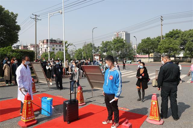 演练现场以情景模拟和现场演练相结合的方式进行。在西校门大门口一侧,开辟了返校学生专用通道。50余名辅导员作为此次演练的志愿者,他们手提行李箱,模拟学生返校,他们间隔1米排队有序进入校门口,工作人员查验身份证和校园一卡通,检测其体温,对其随身行李进行消毒,对于合格者现场开通校园一卡通权限。对于体温异常的学生,学校在校门前设立的学生通道旁,特设了一间观察室,学校医务人员对其进行第二次体温检测和健康情况问询,重点对其身体状况、旅行史、流行病学史、返校交通情况进行询问。根据学校疫情防控方案对其进行留观、用救护车直送吉安市发热门诊等分类处置。