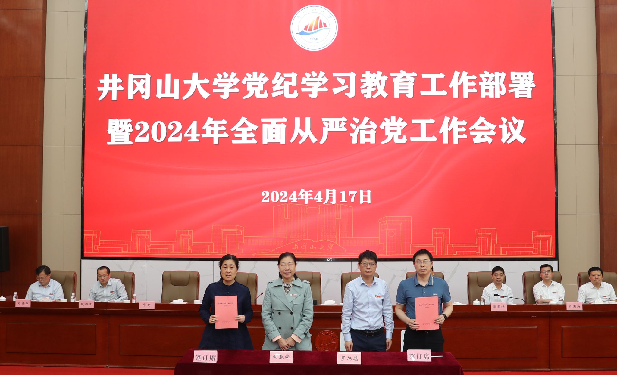 校党委书记胡春晓出席并讲话,党委副书记、校长罗旭彪主持会议,胡春晓、罗旭彪与学校部门、学院主要负责人签订了2024年全面从严治党责任书,党委副书记肖宜安部署党纪学习教育工作,党委常委、纪委书记彭西洪通报了部分违反中央八项规定精神、搞特权典型行为和校内外违规违纪违法的典型案例,并以此进行警示教育,校党政班子成员李军、冷明、敖四江、肖洪海、刘梁军、梁景宏出席。