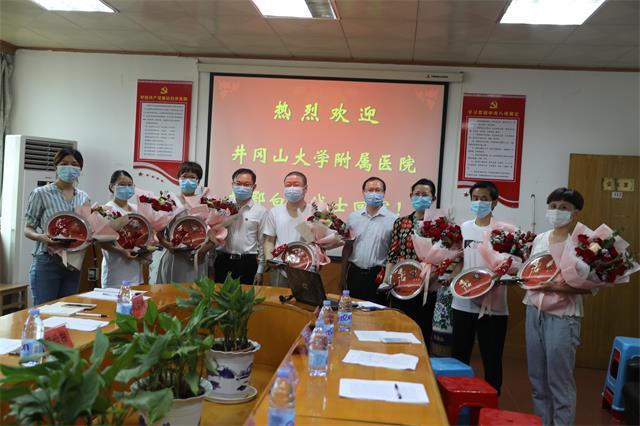 5月6日,是井冈山大学附属医院7名援鄂医疗队员结束休息调养,正式返岗上班的第一天,党委副书记、校长曾建平,党委常委、副校长黄俭根,党委常委、宣传部长李裕福,在有关部门负责人陪同下,来到附属医院看望慰问7名援鄂医疗队员,为他们送上了学校专门设计和个性化定制的极具特色的援鄂纪念盘和井冈红旗,工作人员还为他们献上了鲜花,随后校领导主持召开了座谈会。
