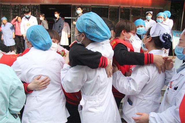 “除却君身三重雪,天下谁人配白衣。”当七名英雄回到医院时,早已列队等候在门口的同事们集体欢呼:“欢迎回家!”迎接英雄,人们满怀崇敬!嘘寒问暖,喜极相拥,迎接英雄更像迎接亲人一样。寒冬总会过去,阴霾终将驱散,人间被再次唤醒。两个多月的疫情磨难,把我们变得更加坚强,我们也更加坚信,没有一个春天不会到来。正如这两个多月来,我们始终期待的愿望正变成现实——白衣执甲,英雄归来。(附属医院)