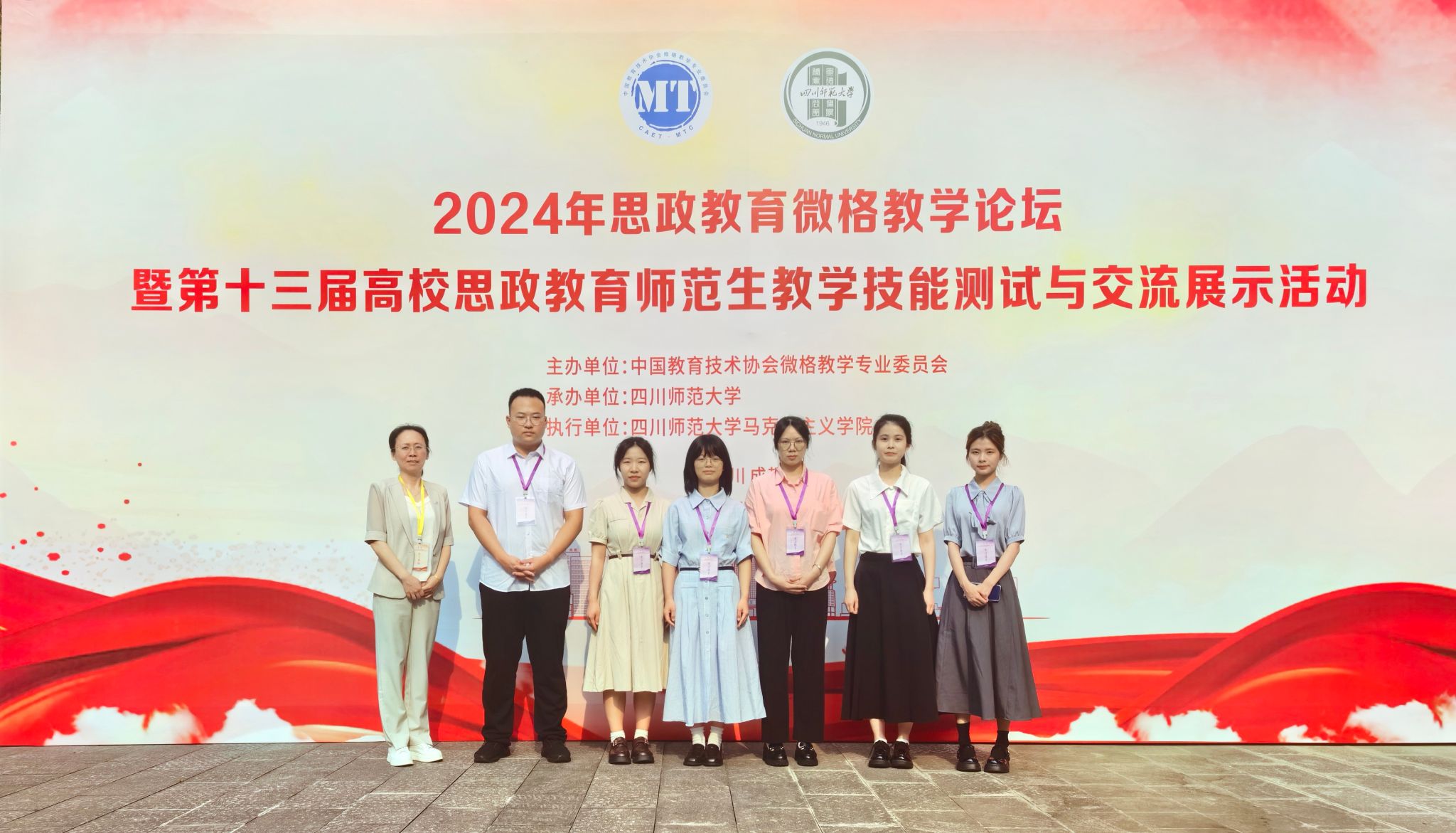 5月24日至27日,2024年思政教育微格教学论坛暨第十三届高校思政教育师范生教学技能测试与交流展示活动在四川师范大学举行。该活动由中国教育技术协会微格教学专业委员会主办,四川师范大学承办。来自华中师范大学、东北师范大学、华南师范大学、西南大学等全国89所高校的409名本科生,44所院校的138名思政研究生参加了此次活动。我校马克思主义学院思想政治教育专业的6名学生表现优异,以独具匠心的教学设计、引人入胜的教学展示、沉着冷静的答辩,荣获一等奖3项,二等奖2项,三等奖1项。这是我校参加该项赛事以来取得的最好成绩。