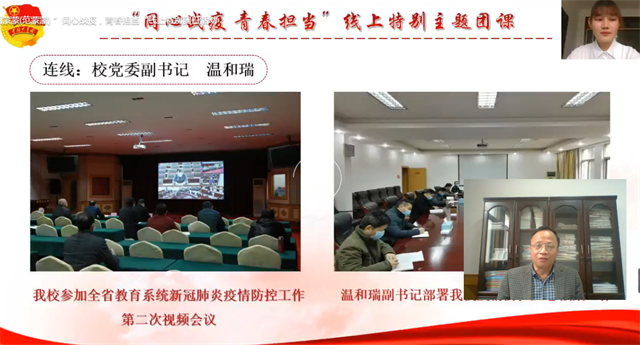 为进一步加强疫情防控的教育引导,深入推进爱国主义教育和制度自信教育,激发广大团员青年的责任担当, 3月26日下午,校团委举办了以“同心战疫 青春担当”为主题的线上特别主题团课。校党委副书记温和瑞,党委常委、副校长黄俭根,受邀参加线上互动交流活动,向300余名团员青年介绍学校疫情防控情况,对大家如何做好居家学习、参与疫情防控工作提出希望和要求。援鄂医护人员代表附属医院ICU主任韦华璋,附属医院护士、武昌方舱医院护理小组组长杨群,以及抗疫青年志愿者代表陈涵芳、钟悦榕同学也参加了线上活动,分享了他们参与抗疫志愿服务的动人故事。