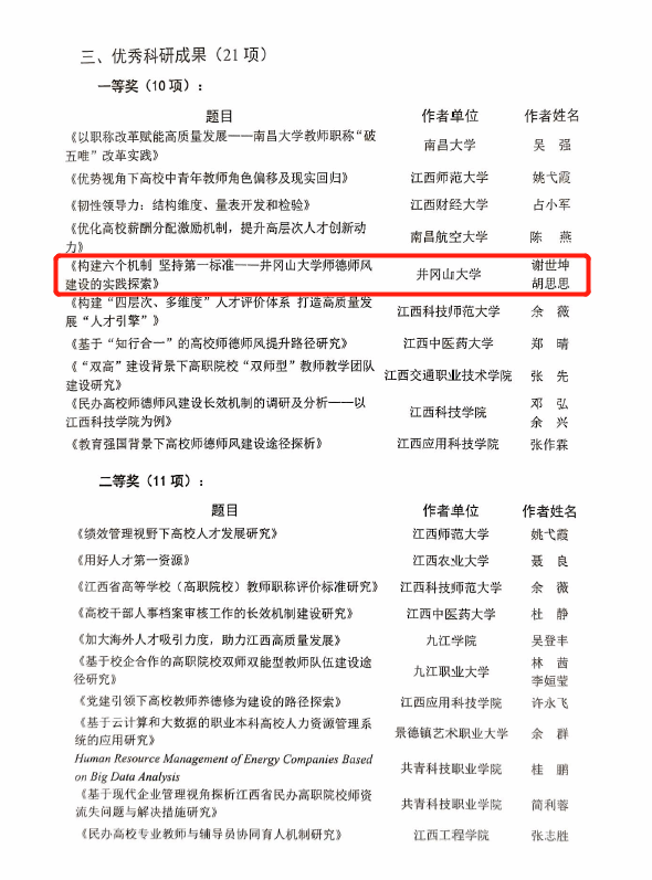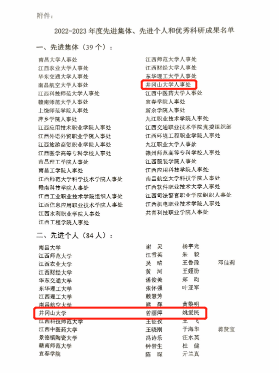 近日,江西省高等学校人事管理研究会发布了《关于表彰2022-2023年度先进集体、先进个人和优秀科研成果的决定》,我校人事处在60多家会员单位中喜获佳绩。其中人事处荣获“先进集体”荣誉称号;曾丽萍、姚爱民等2名同志荣获“先进个人”荣誉称号;由谢世坤、胡思思撰写的《构建六个机制 坚持第一标准——井冈山大学师德师风建设的实践探索》一文荣获优秀科研成果一等奖。