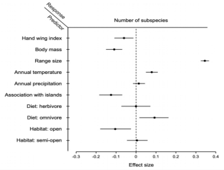 图1. 全球7092个鸟类物种的亚种数和手翼指数分布情况