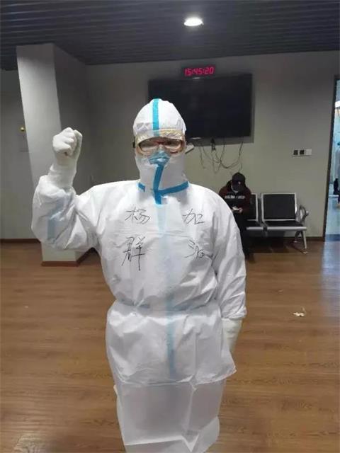 武装起来的我们,认不清谁是谁。为了方便辨识,大家都会把自己的名字写在防护服上,还会加上自我鼓励的话语。
