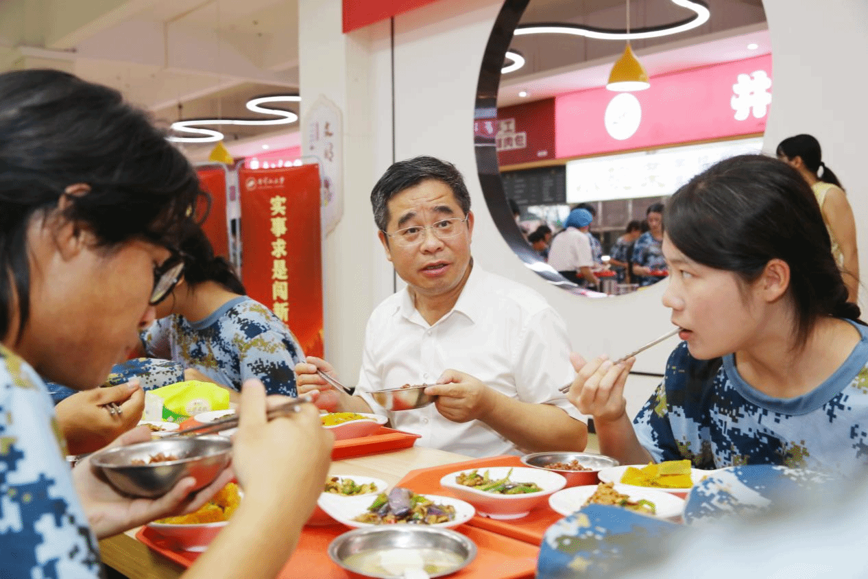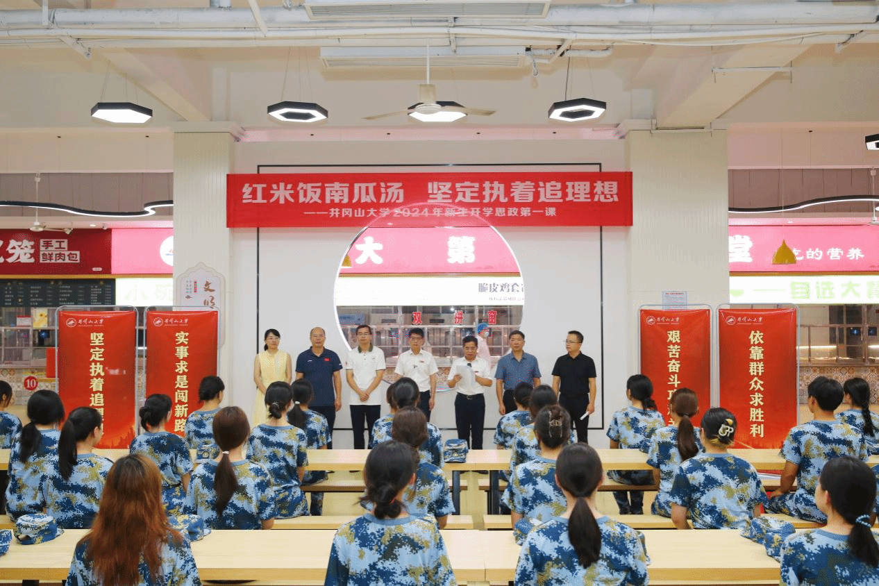 晚上七点,一食堂里歌声嘹亮,一场生动的微思政课正在热烈进行……井冈山大学党委副书记、校长罗旭彪,党委副书记肖宜安带着 120 余名新生代表和教师同唱红色歌曲《毛委员和我们在一起》。食堂变成思政课堂,校领导与师生同颂毛泽东诗词、同唱红色经典、同吃红米饭和南瓜,在共进晚餐中话革命历史,体悟井冈山精神。