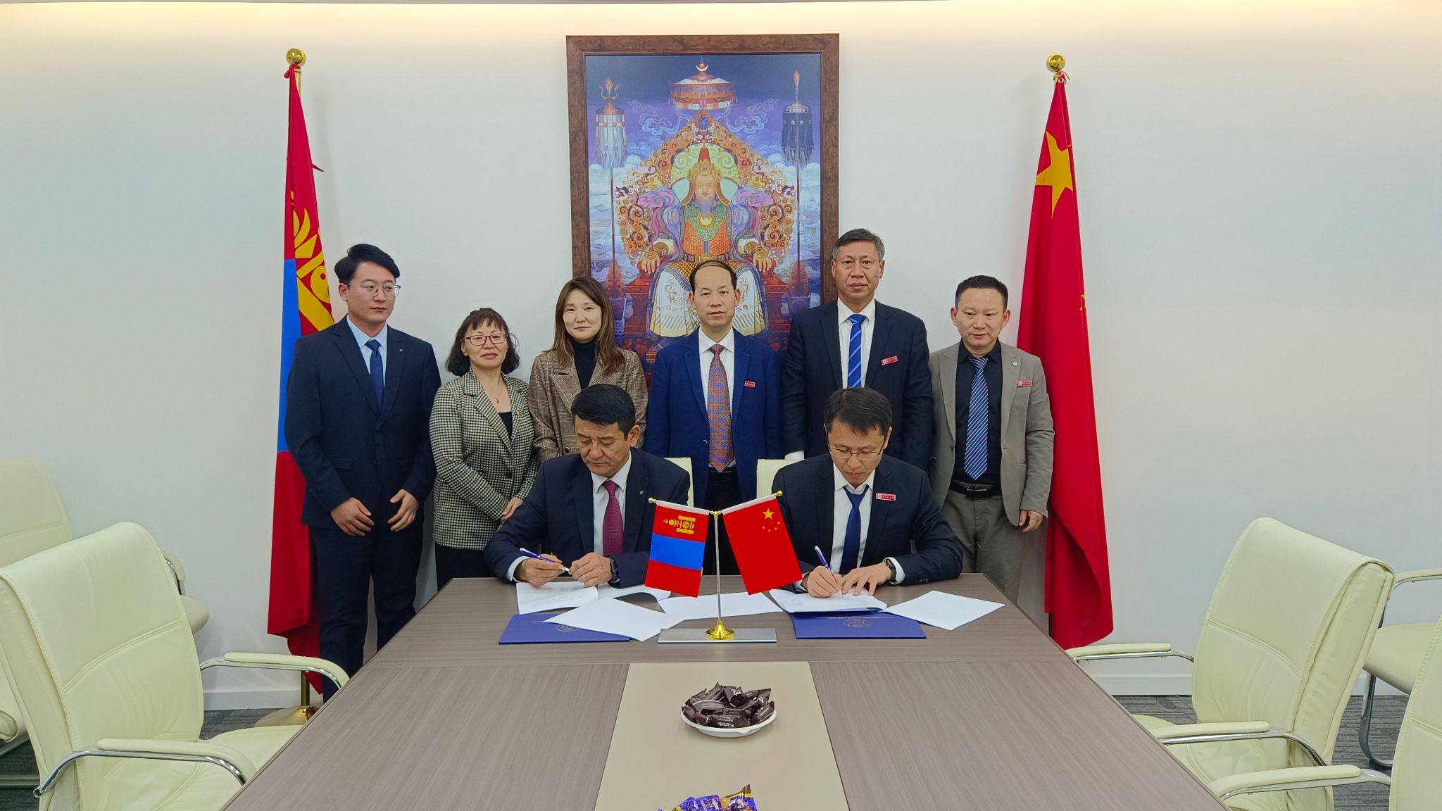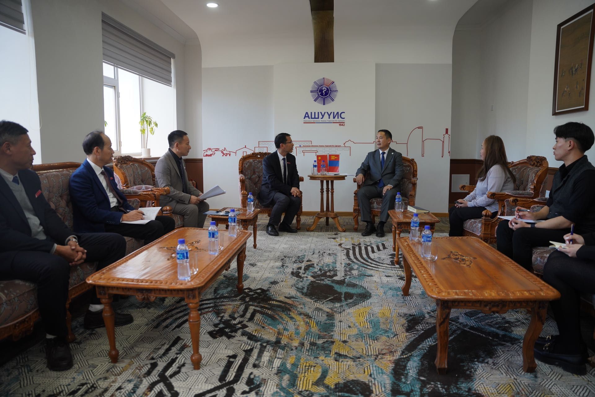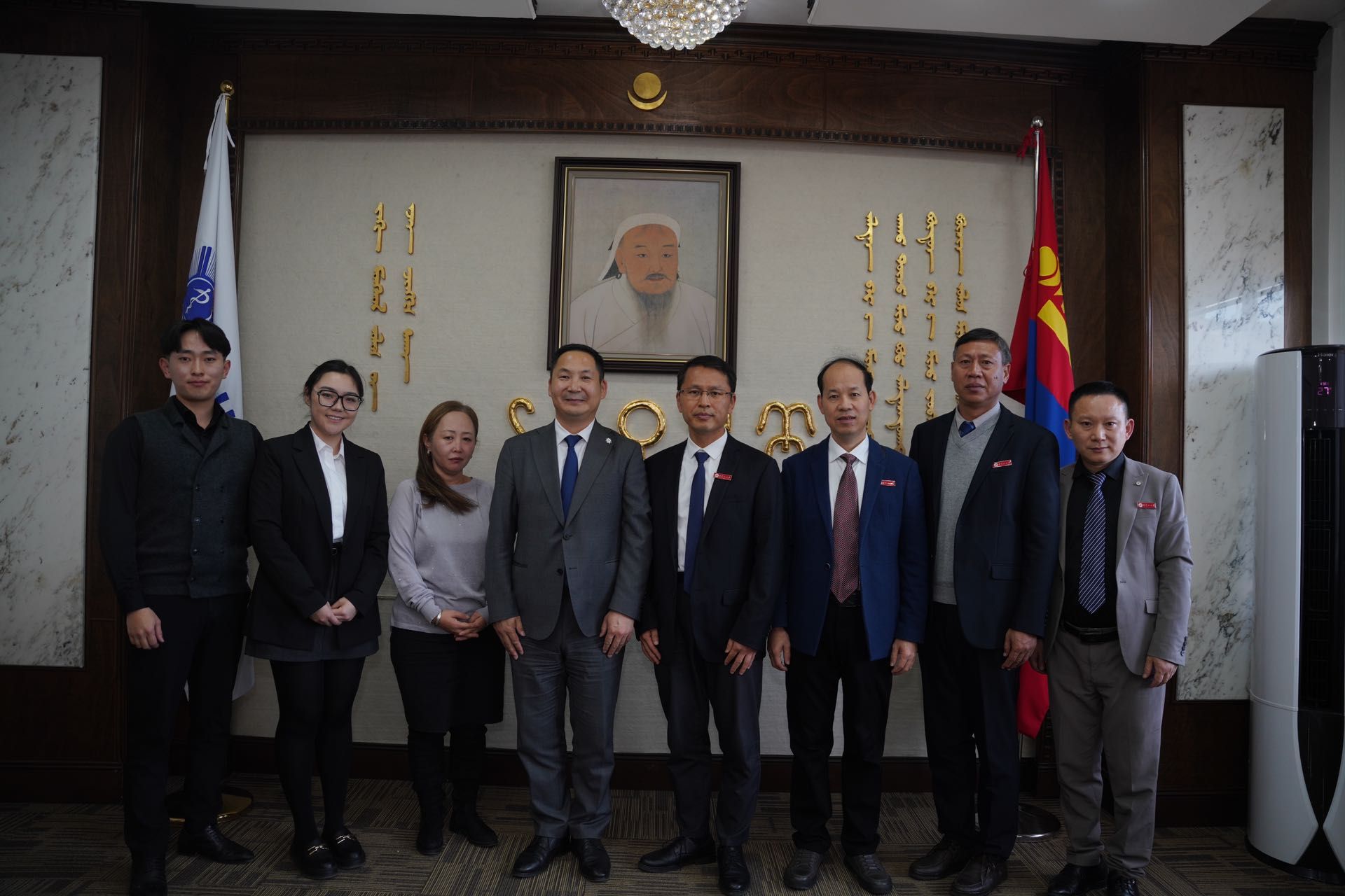 在蒙古期间,冷明一行访问了蒙古国立医科大学,与该校副校长Belegtsaikhan Tsolmon及国际关系处会面并座谈,商定两校在医学领域开展师生交流、蒙医与中医交流及联合科研等。在蒙中联合国际大学,冷明一行与该校校长额·恩和太平进行了座谈,两校就学生互换、本升硕、师资交流及来华留学生招生等方面进行了深入探讨,并签订了校际合作协议书。期间,代表团一行还与蒙古Pineapple LLC Mongolia机构就开展来华留学进行了线上洽谈,达成了合作意向。