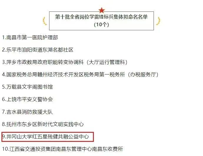 3月7日,江西省第十批学雷锋活动示范点和岗位学雷锋标兵评选正式公布结果,我校红五星残健共融公益中心被列为“全省岗位学雷锋标兵集体”,成为本批次全省教育系统中唯一获此荣誉的团队。