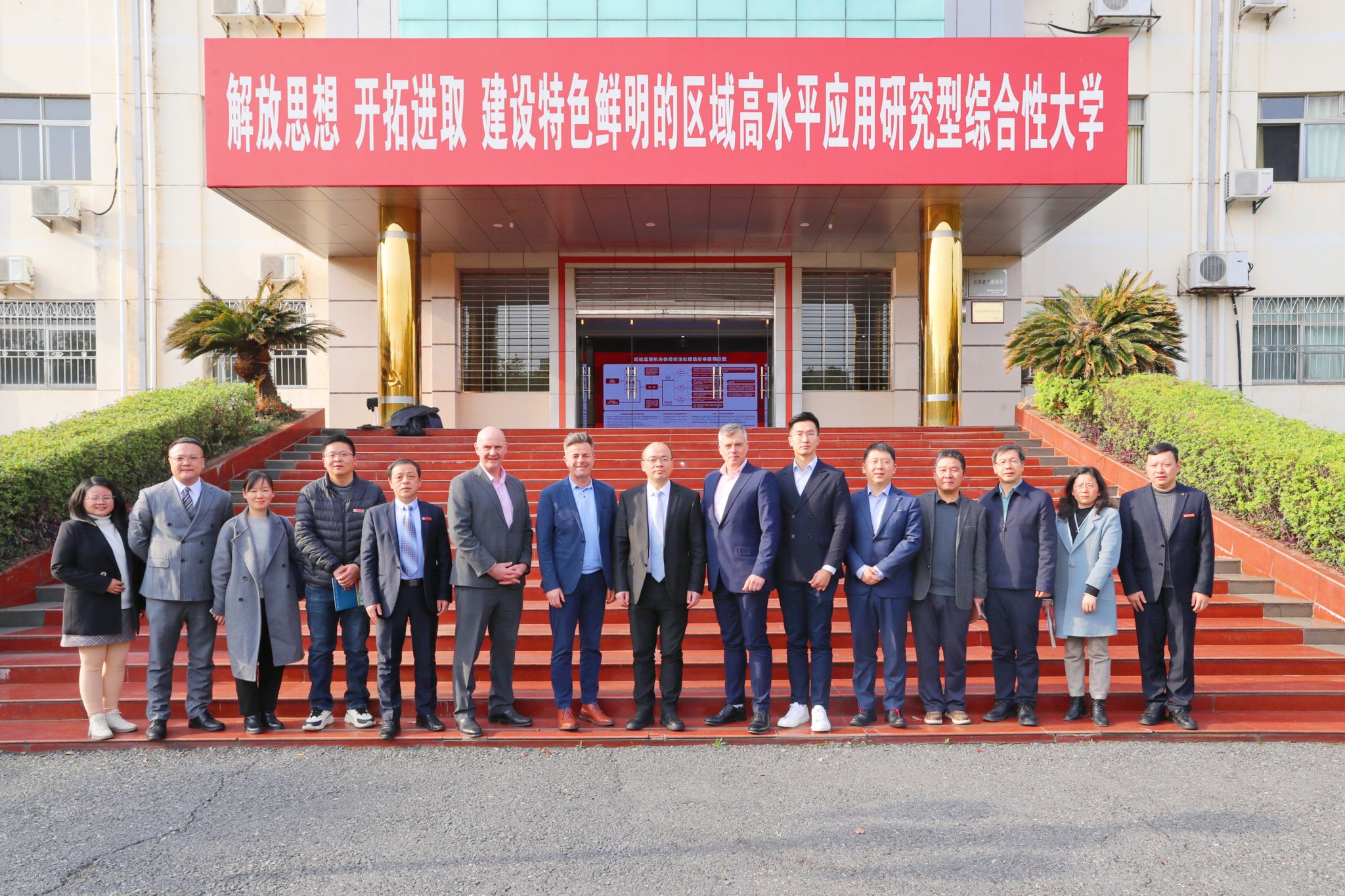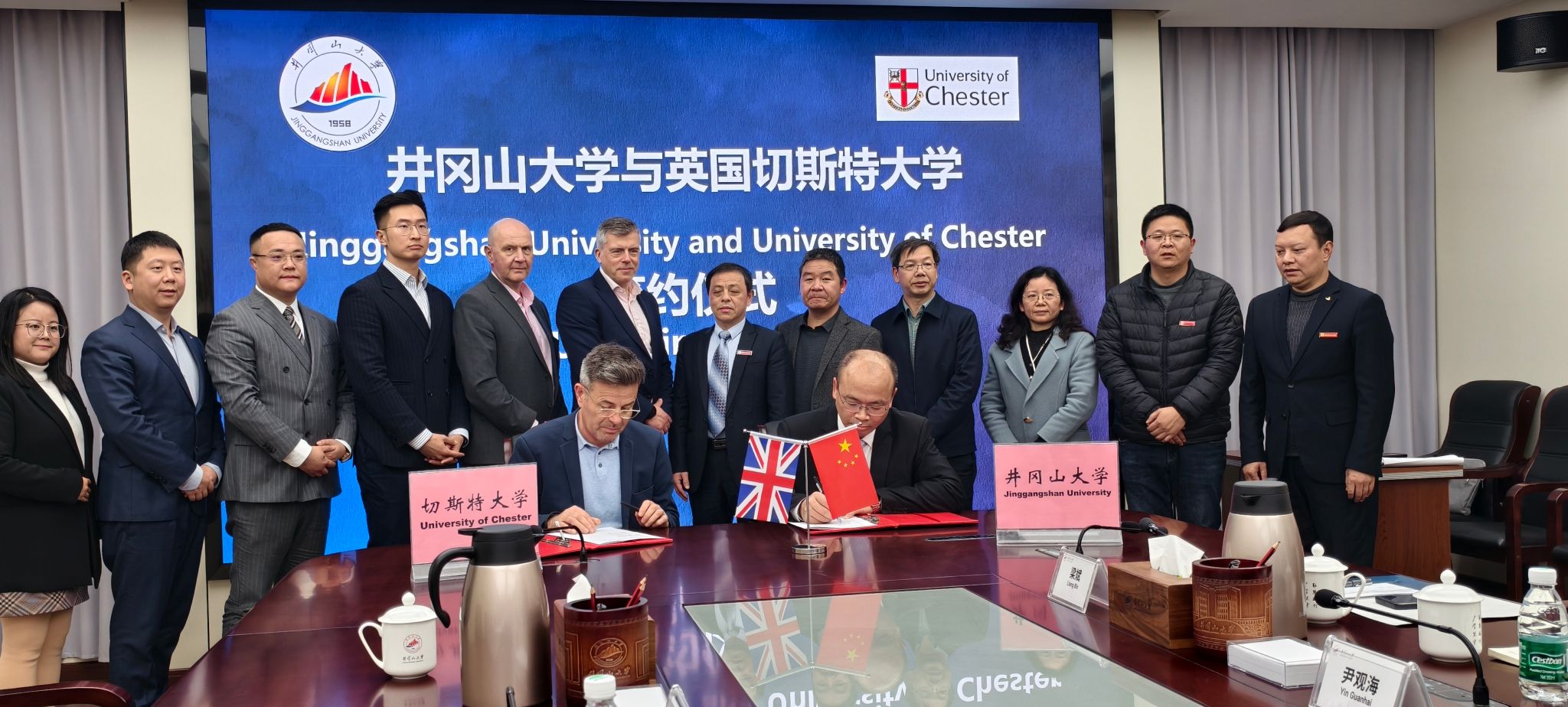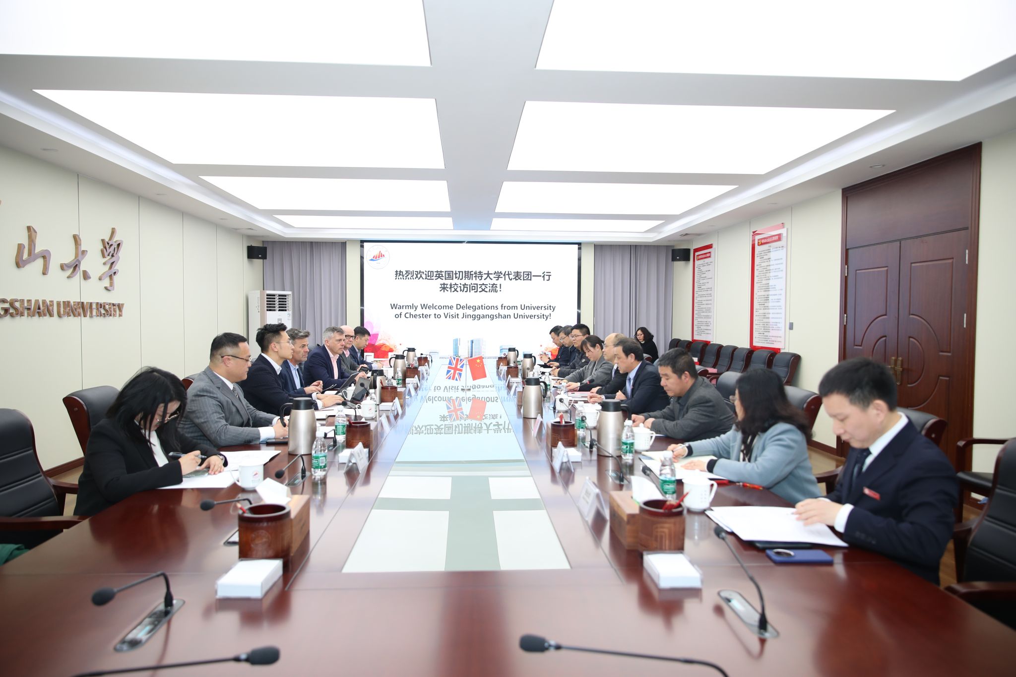 3 月 17 日,英国切斯特大学副校长(分管国际事务)大卫・麦克拉维、副校长柯特・奥尔曼(分管教学学术)、全球发展中心主任彼得・理查兹等一行7人来我校访问交流并开展项目洽谈。校党委常委、副校长黄族豪出席会议,国际合作与交流处、商学院、电子信息与工程学院、教务处、招就处相关负责人参会。