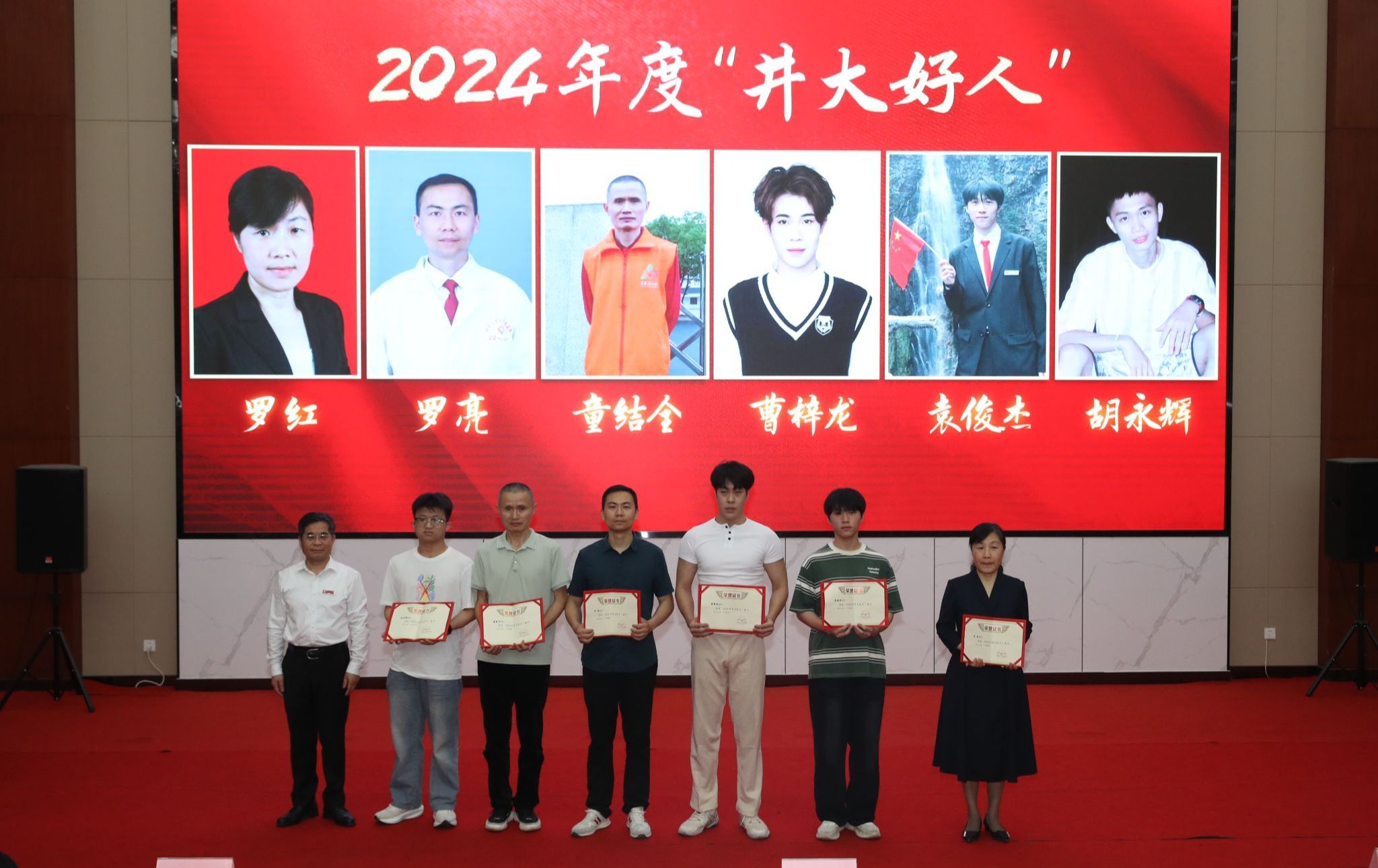 活动在"井大好人"颁奖仪式中启幕。图书馆副研究馆员罗红、井冈山大学附属医院肿瘤科主治医师罗亮、资产经营公司电商服务中心副主任童结全、体育学院学生曹梓龙、艺术学院学生袁俊杰以及电子与信息工程学院学生胡永辉获评本年2024度“井大好人”称誉。