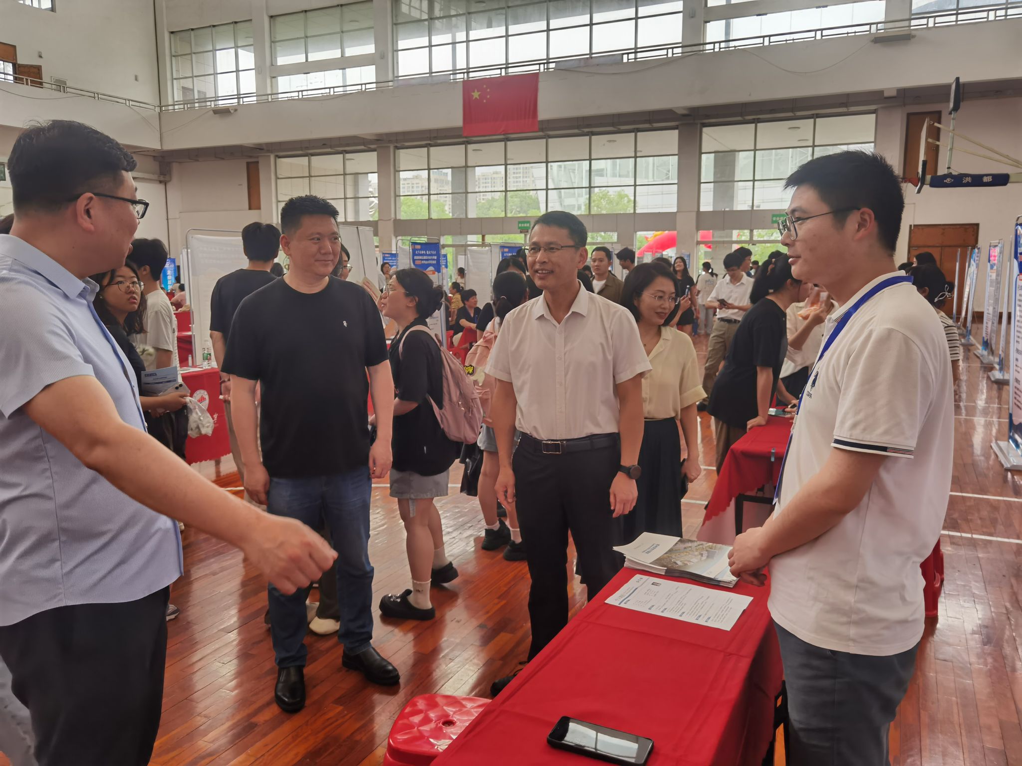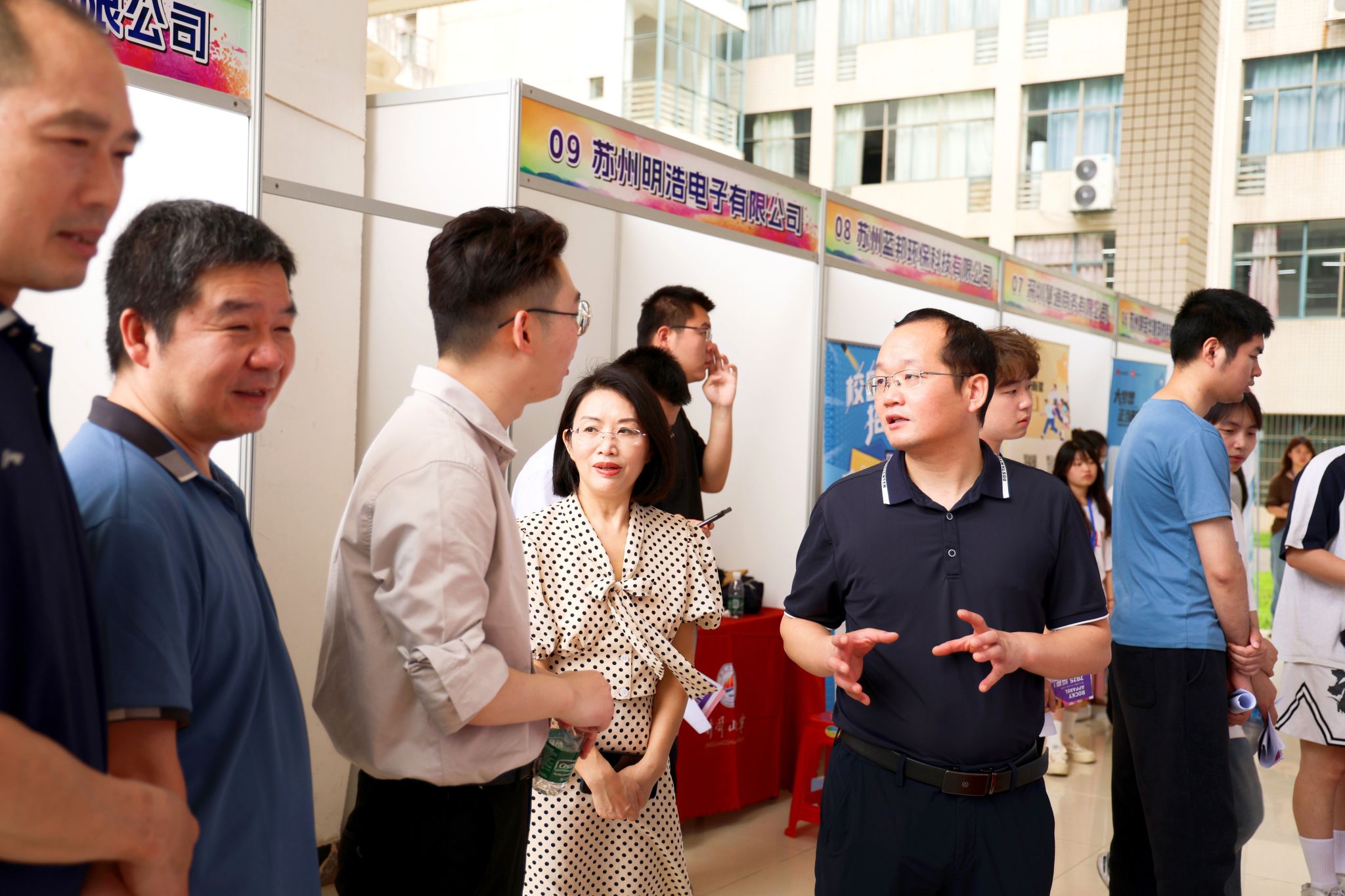 校党委副书记肖宜安与来校参加招聘的单位座谈交流。校党委常委、副校长冷明,校党委常委、副校长敖四江分别来到招聘会现场,了解毕业生就业意向与求职进展,鼓励他们积极求职,并与苏州、南昌等地相关部门交流了解人才政策、企业招聘、供需适配等情况,向用人单位重点推荐我校毕业生。