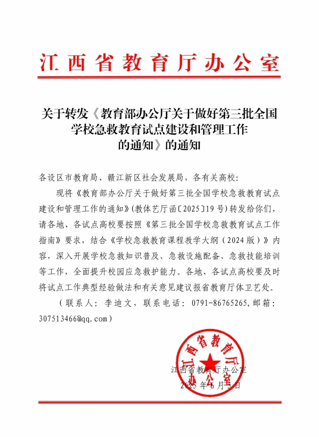 近日,教育部办公厅公布了发布《关于做好第三批全国学校急救教育试点建设和管理工作的通知》,经学校申报、省级教育行政部门推荐、专家复核、公示等程序,学校成功入选第三批全国学校急救教育试点学校名单,标志着学校在急救教育领域的努力与成效获得了高度认可。