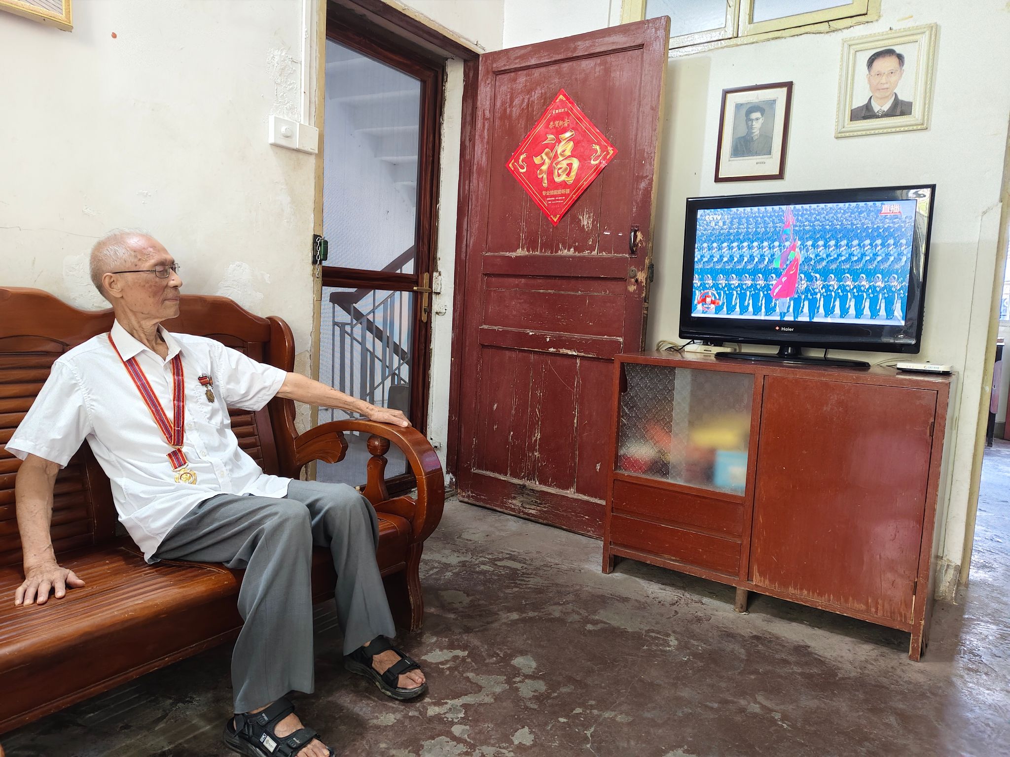 退役老兵、学校退休教师金维清在家观看仪式。