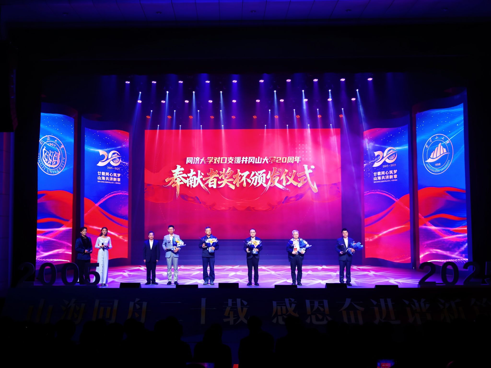 当晚,同济大学对口支援井冈山大学二十周年晚会在井冈山大学学生会堂精彩上演。晚会以“山海同舟二十载 感恩奋进谱新篇”为主题,通过“山海相逢”“同心硕果”“再启新程”三个篇章,用光影、舞蹈、诗音画等多种艺术形式,回溯两校二十载协作历程,生动展现山海携手、薪火相传的深情厚谊与奋进姿态。晚会还举行了两项特别的仪式:肖宜安为历任校助颁发了突出贡献奖,双方校领导登台举行《未来之约》仪式,为“未来之树”浇灌黄浦江水和赣江水,象征两校跨越山海的情谊生根、梦想发芽。