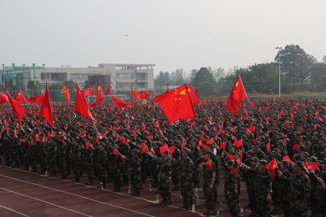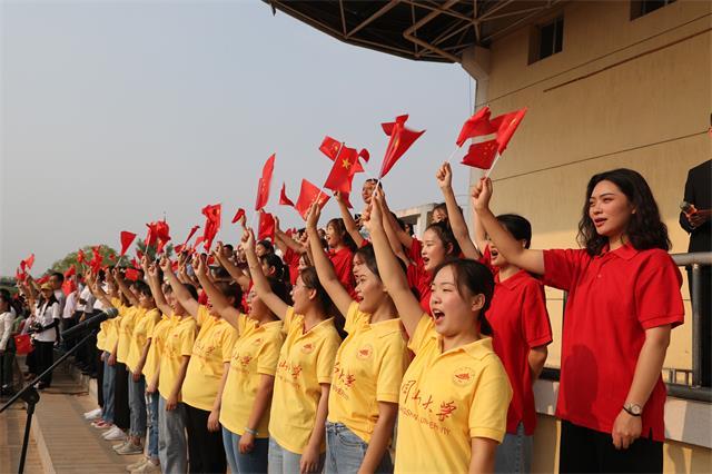“五星红旗迎风飘扬,胜利歌声多么响亮;歌唱我们亲爱的祖国,从今走向繁荣富强。”9日上午, 2019级新生开学典礼暨军训动员大会现场成了一片红色的海洋。在高亢的国歌奏响后,4300余名新生佩戴上井冈山大学校徽,庄严宣誓,表达自己爱校爱国的浓烈情感,洋溢着对美好未来的向往和坚定信心。伴随着典礼进行到高潮,全体新生和师生代表热情挥动着五星红旗,齐声唱响《歌唱祖国》,共同庆祝中华人民共和国成立70周年,表达对祖国母亲的热爱与祝福,奏响了青春告白祖国的最强音。