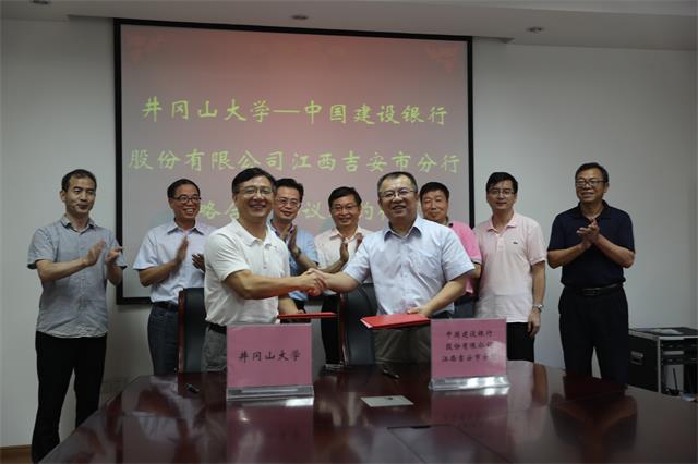 6月27日下午,我校与建设银行吉安市分行全面战略合作协议签约仪式在校举行。建设银行江西省分行副行长王珣,党委副书记、校长曾建平出席并讲话,副校长左继生和建设银行吉安市分行行长徐斌分别代表双方签订协议,党委常委、副校长吕玉华主持签约仪式,建设银行吉安市分行有关负责人和我校有关部门负责人见证了签约仪式。
