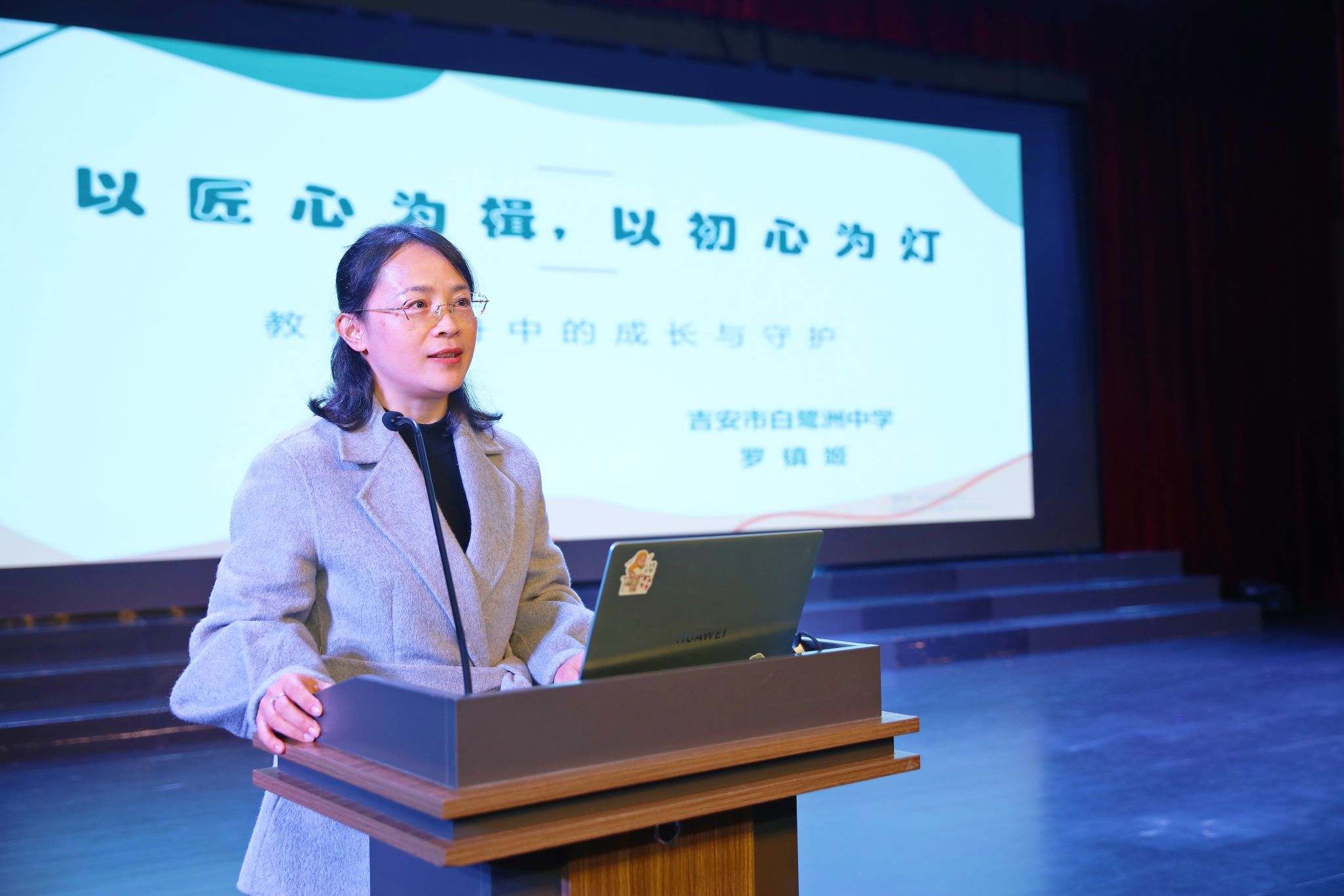 罗镇姬以“以匠心为楫,以初心为灯”为题,回顾了自己从一名大专毕业生成长为全国优秀教师的28年从教历程。初登讲台,她曾被家长“挑剩”,但两年后,她凭“换位思考”的教学方法拿下全县中考物理第一名。为弥补专业短板,她携家人一同赴南昌攻读教育硕士,深夜在厨房苦读,从不轻言放弃,“没有尝试就放弃,就意味着永远没有成功的机会”。她坚信“亲其师,信其道”,即便面部受伤缝针、脚踝骨裂,也坚持站上讲台,“身体的伤痛无法阻挡教育的脚步,因为心中有一份对学生的责任与热爱”。她还分享了一位后进生通过自制乐器实验重拾自信、物理成绩跃升至优秀的故事,动情地说:“因为被看见,所以优秀。”